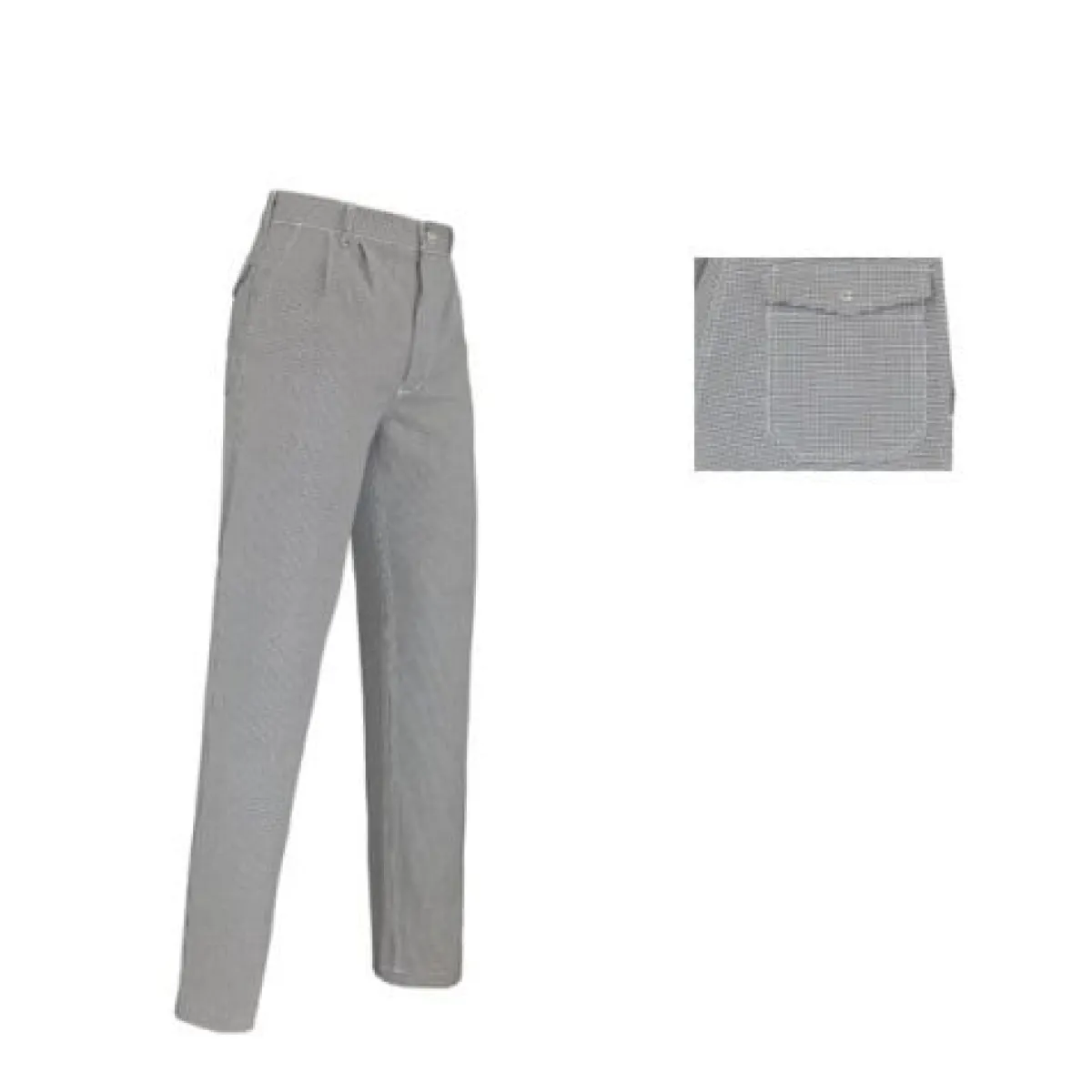 Bakkersbroek met dubbele bandplooi en elastiek in achterpand tailleband, 2 steekzakken en een opgezette achterzak met klep en drukknoopsluiting (zonder bies).