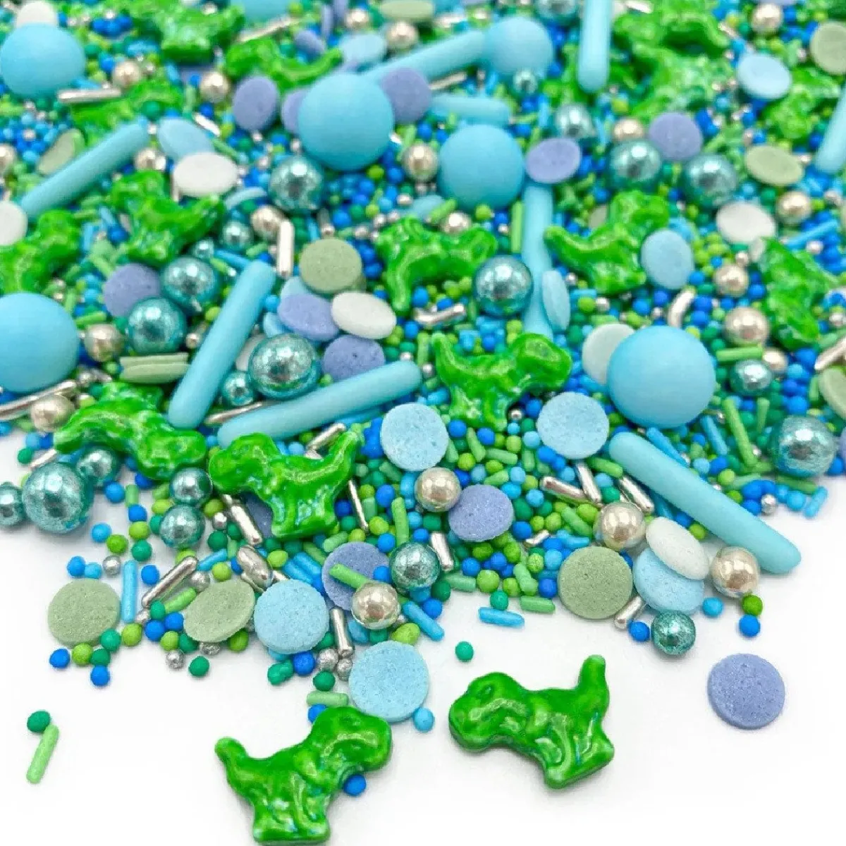 Versier allerlei lekkernijen met deze schattige Sprinkles Jurassic Dino Party 500g! De mix bestaat uit groene en blauwe strooisels met uiteraard leuke dinosaurus figuren. Prima te gebruiken voor diverse baksels, chocoladelekkernijen of desserts.