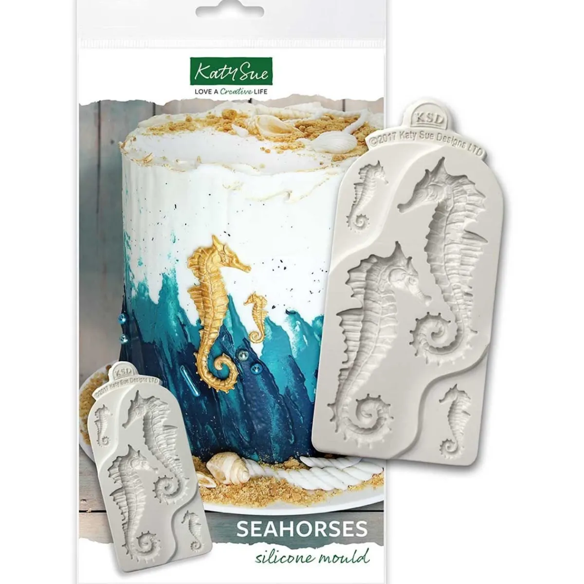 De Katy Sue Mold Zeepaardjes bevat 2 grote en 2 kleine zeepaardjes. Zeepaardjes zijn erg leuk ter decoratie van baksels met het thema onderwaterwereld. Met deze mold kun je eetbare decoraties maken om daarmee vervolgens je zelfgemaakte taarten, cupcakes of koekjes te versieren. Deze mal is goed te combineren met de andere Katy Sue Molds zoals de bubbels en parels of de vis, zeewier en koraal. De mold kan gebruikt worden met fondant, modelleer pasta, marsepein, chocolade, snoep en gekookte suiker.