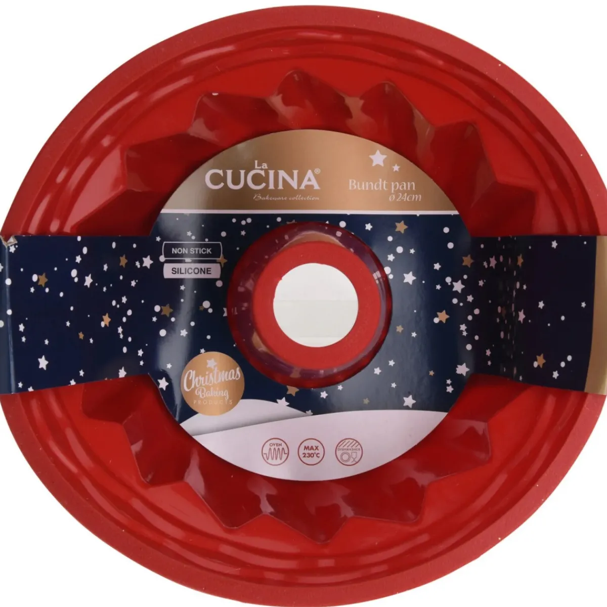 De Siliconen Bakvorm Tulband Ø24cm is een ronde vorm met een gat in het midden en aan de buitenkant sierlijke patronen. Prachtig voor feestelijke lekkernijen. Deze vorm heeft een rode kleur en is gemaakt van siliconen.