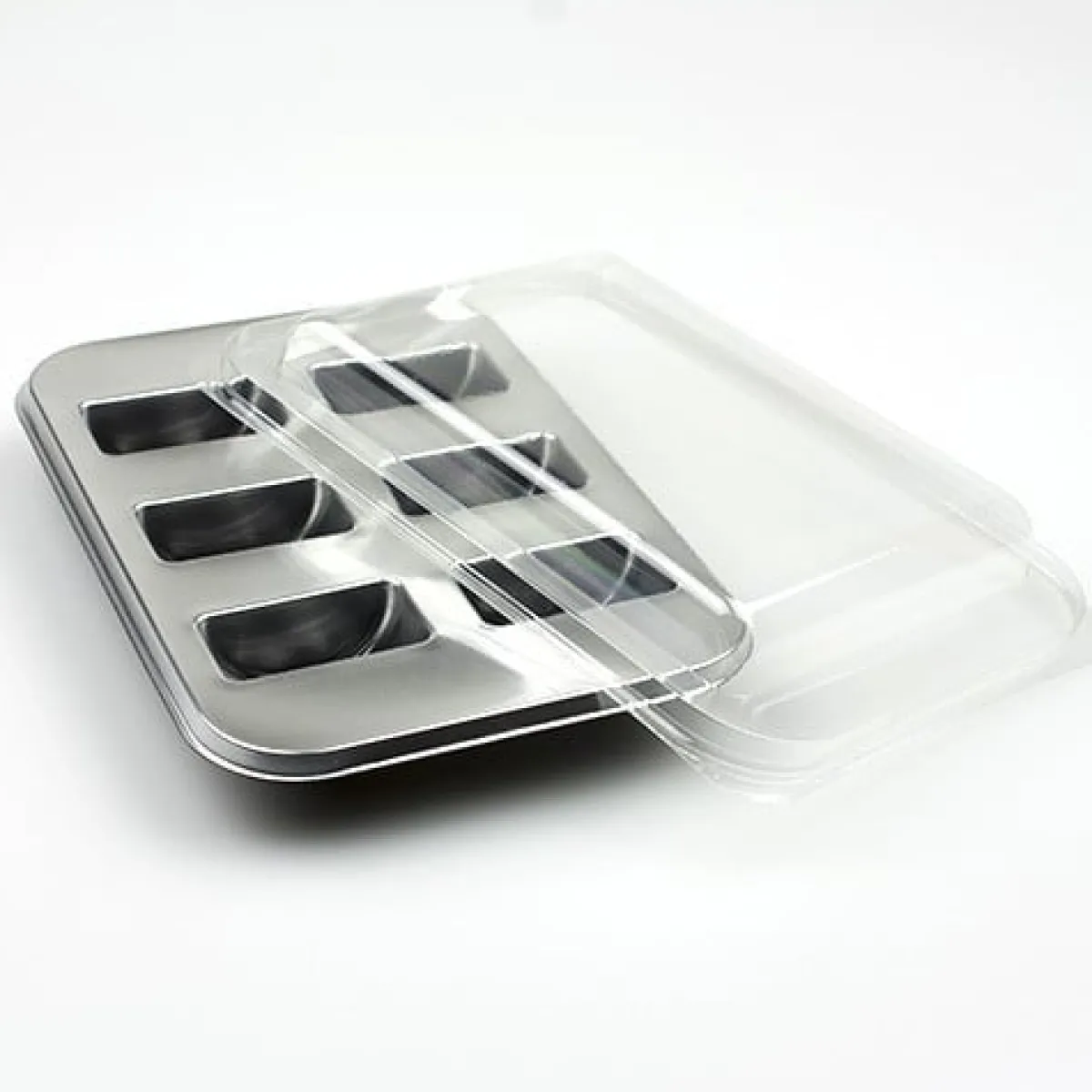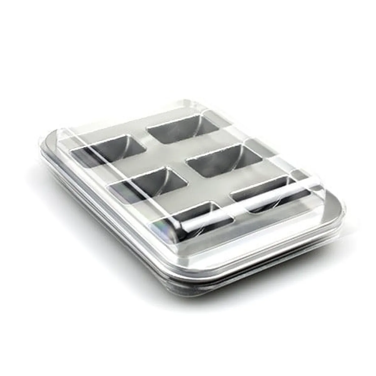 Plastic verpakking voor het presenteren van 6 macarons. De verpakking bestaat uit een zilverkleurig tray en een transparante deksel. De macaron-verpakking wordt per stuk verkocht.