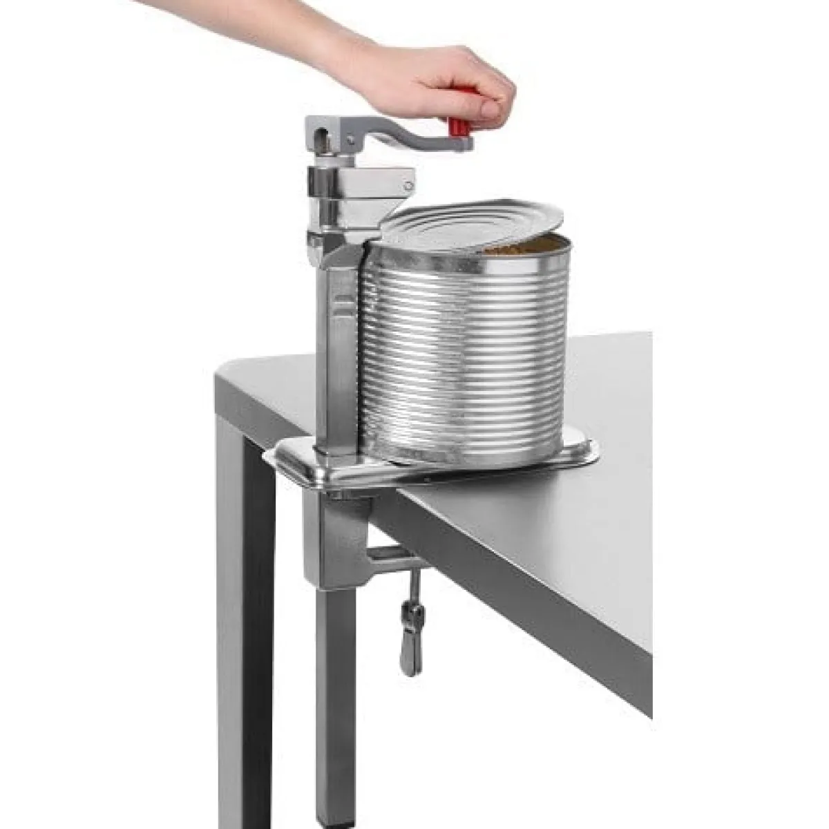 Staartbusopener tafelmodel van het merk Hendi. De blikopener kan worden bevestigd middels een duimschroef. De staartbusopener is geschikt voor blikken tot 40 cm en is gemakkelijk schoon te maken. Het vervangen van het mes of wiel kan eenvoudig en snel zonder gereedschap.