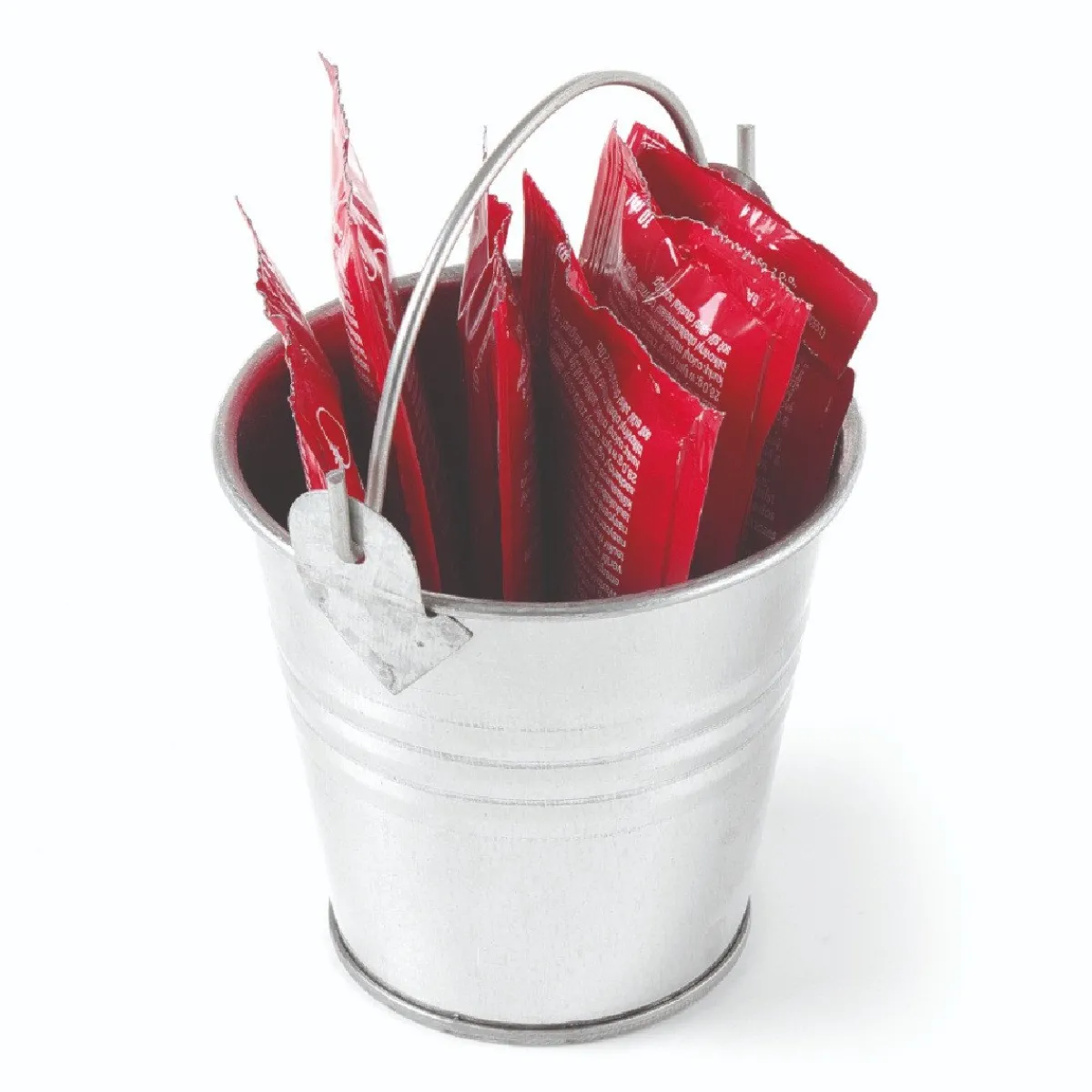 Het emmertje is leuk om voorverpakte sausjes, snoepjes, koekjes of chocolaatjes in te presenteren. Ook leuk om bestek in te presenteren bij een buffet of high tea.