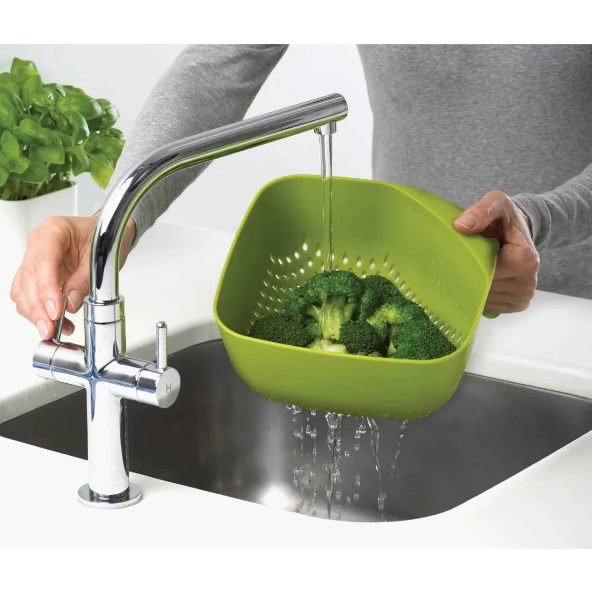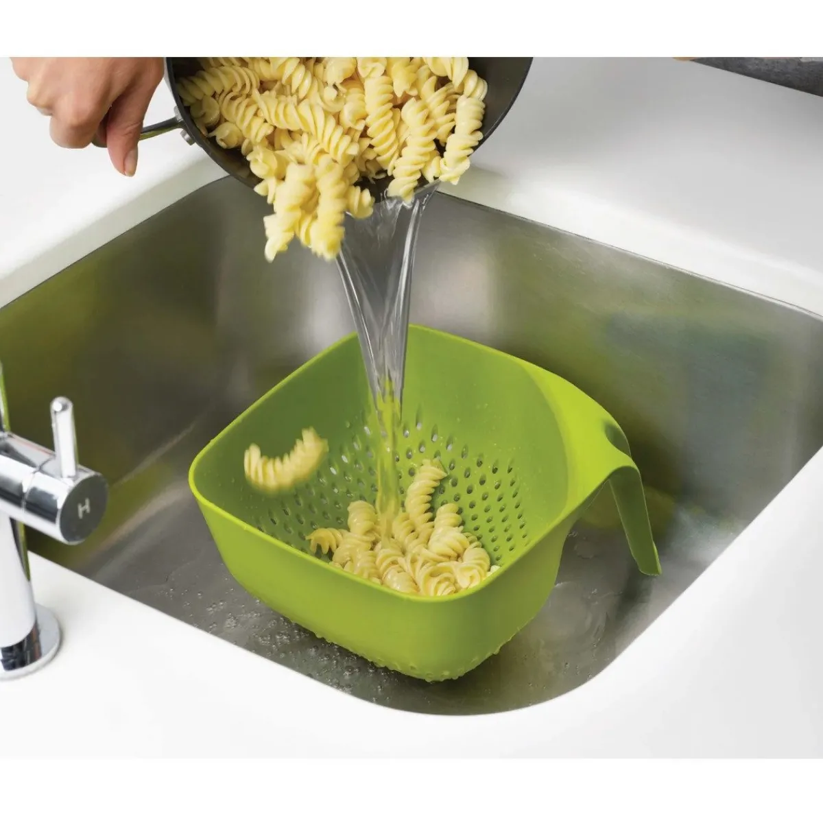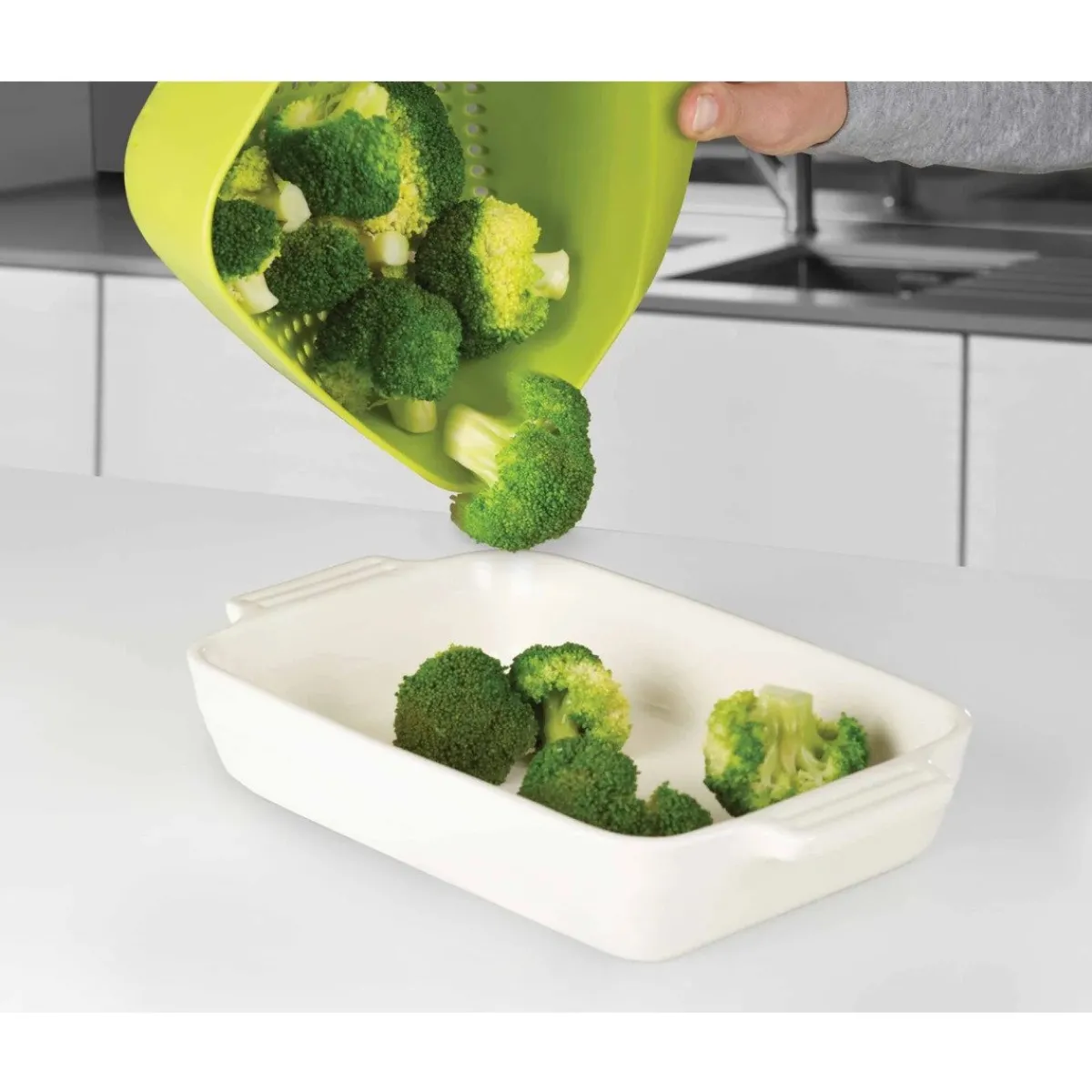 Het Joseph Joseph Vergiet Vierkant heeft een groene kleur en een vierkante vorm. Door de hoeken is het eenvoudig om je etenswaar over te gieten. Daarnaast heeft hetvergiet een ergonomische handvat. Deze zorgt ervoor dat het vergiet stabiel is en rechtop blijft staan. Tevens is het design ruimtebesparend. Ideaal om allerlei eten zoals, pasta of aardappels af te gieten.
