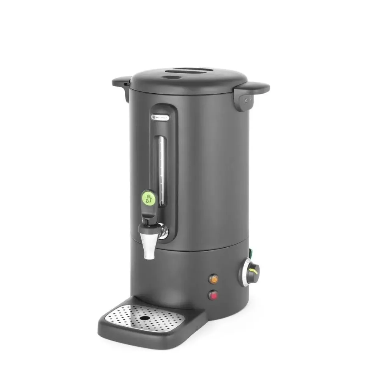 Ontworpen door de gerenommeerde Nederlandse ontwerper Robert Bronwasser. Het unieke ontwerp met oog voor detail maakt dit apparaat een blikvanger op elk buffet. Enkelwandige behuizing van roestvast staal. Stijlvolle handgrepen en deksel van polypropyleen. Unieke non-drip kraan. Peilglas van polycarbonaat met maatverdeling. Magnetisch gekoppelde lekbak, gemakkelijk te reinigen. Thermostaat-indicator. Met maximaal vloeistofniveau indicator in de ketel. De temperatuur kan worden ingesteld tussen 30°C en 100°C. Max. Cuphoogte: 100 mm. Resetknop – voorkomt oververhitting. Indicatielampje toont de voortgang van de verhitting en geeft aan wanneer ontkalking nodig is. Uitermate geschikt om te gebruiken bij andere vloeistoffen zoals melk of warme chocolademelk.