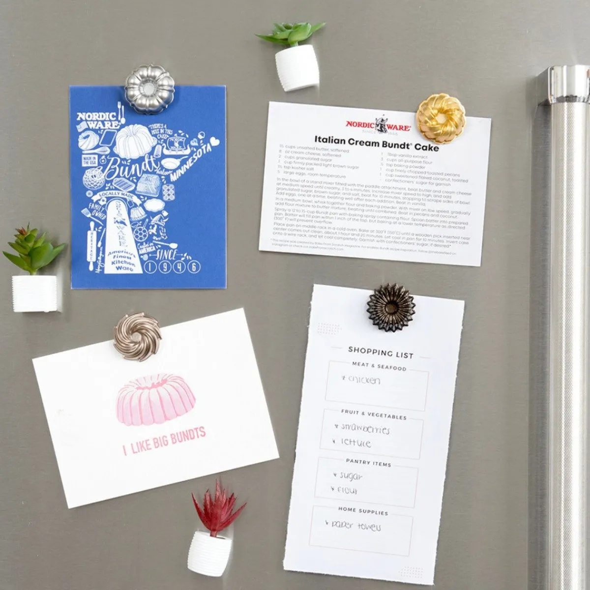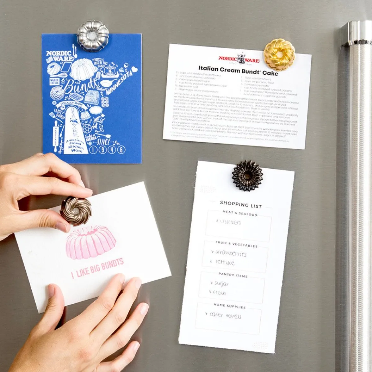 Ben je fan van het merk Nordic Ware? Dan zijn de Nordic Ware Bundt Magneten Set/4 echt wat voor jou! Deze magneten komen in een set van 4, in de kleuren goud, zilver, brons en toffee. De magneten zijn sterk genoeg om foto’s, kaarten of recepten vast te houden.