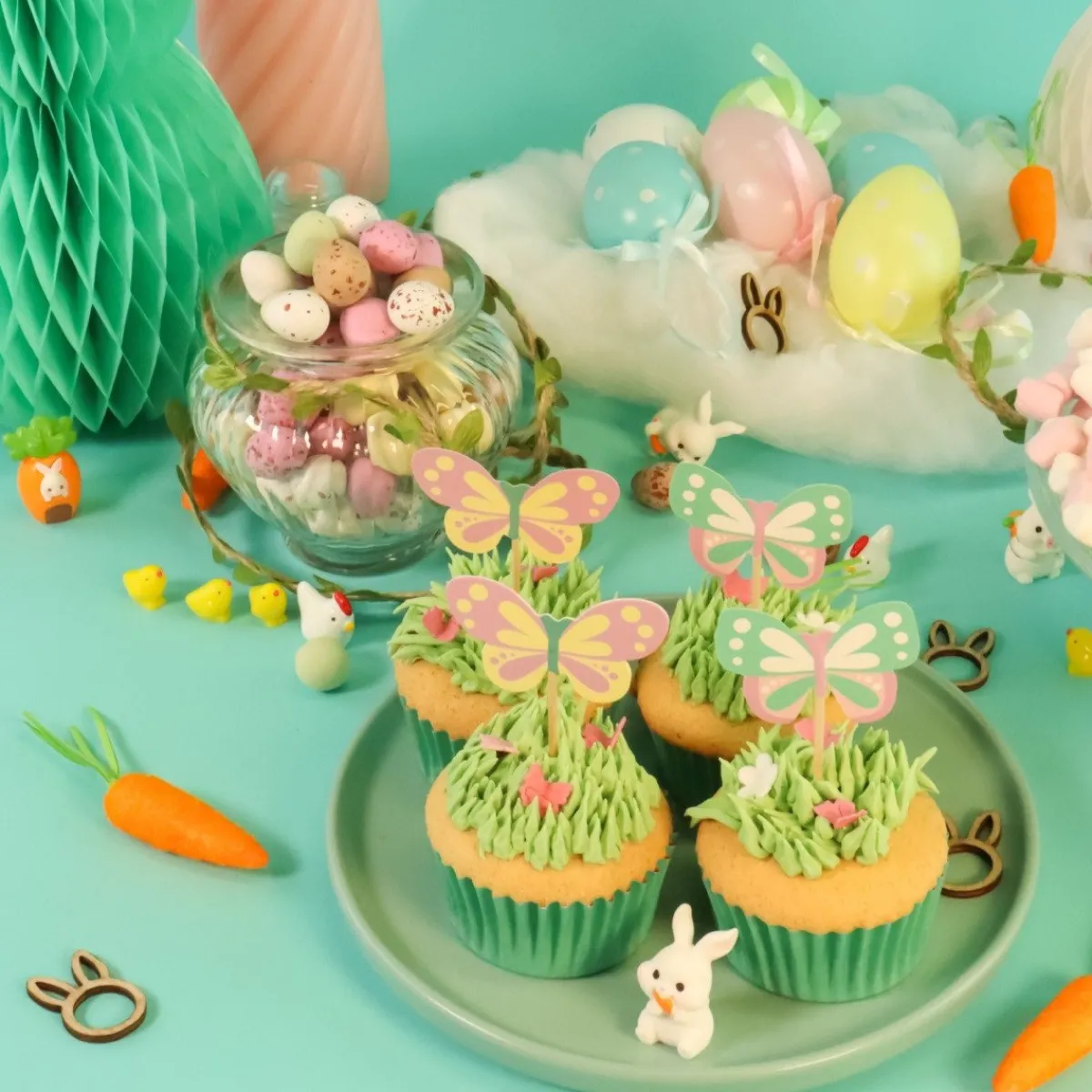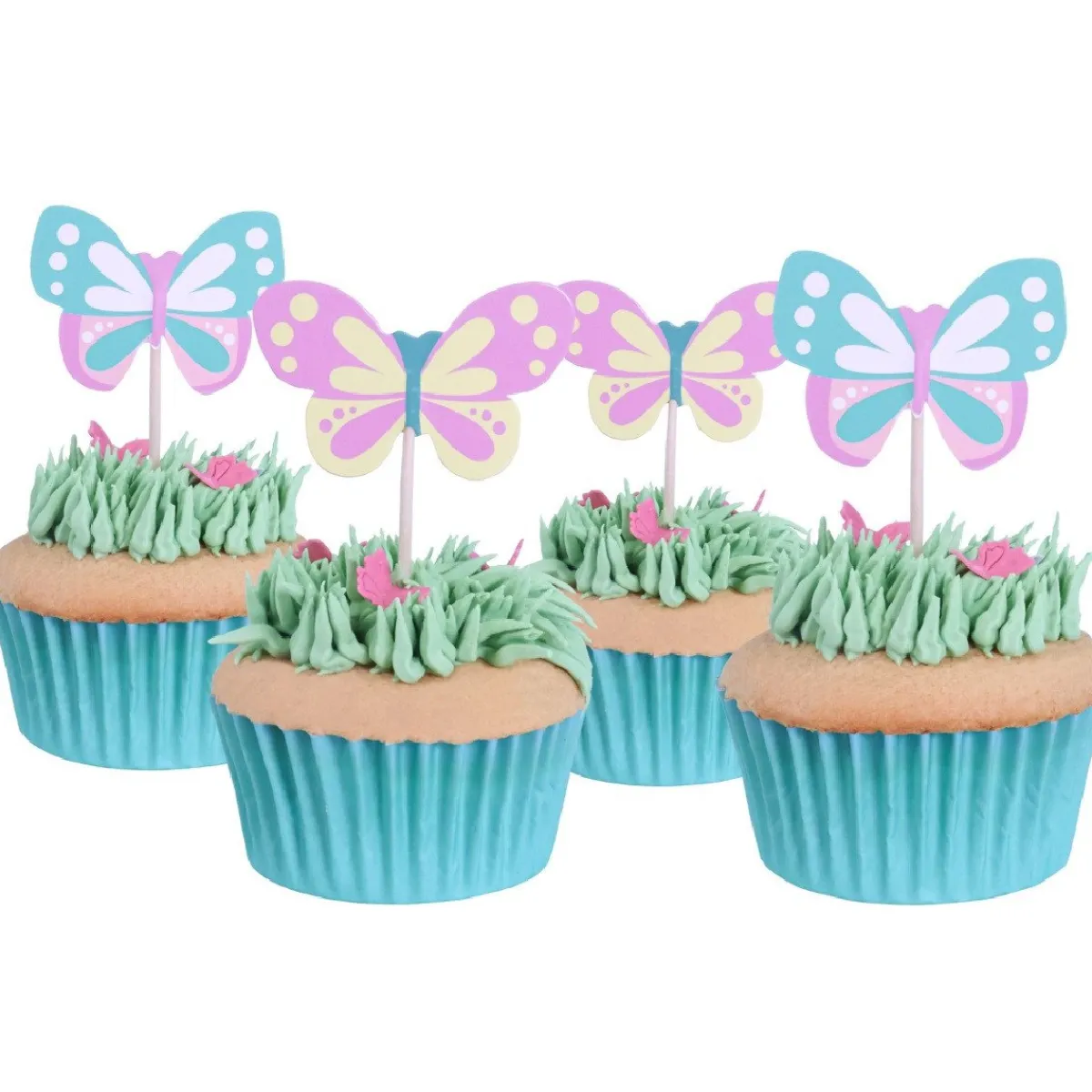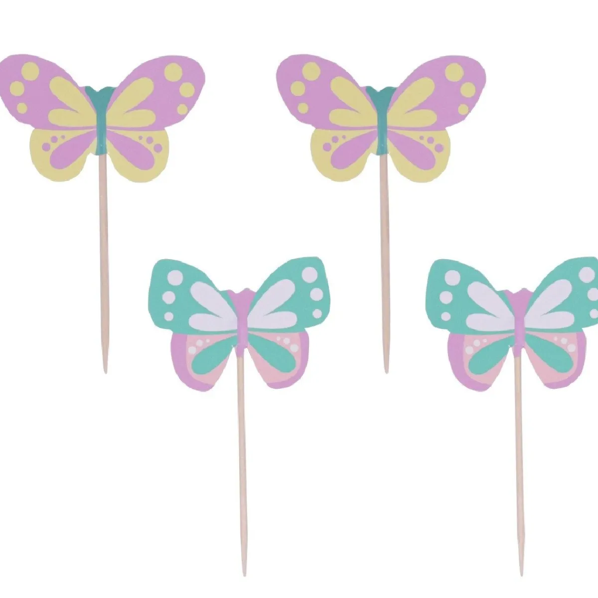 De PME Taartprikkers Vlinders 24st zijn vrolijke prikkers met een papieren decoratie. In de verpakking zitten 24 taartprikkers in 2 verschillende kleuren. Elke topper bestaat uit een houten prikker van 4,5 centimeter en een papieren vlinder van 3,1 bij 5,1 centimeter.