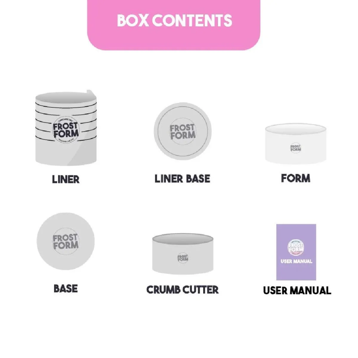 - Inhoud: liner, bodem liner (liner base), vorm (form), bodem (base), uitsteker (crumb cutter), handleiding.