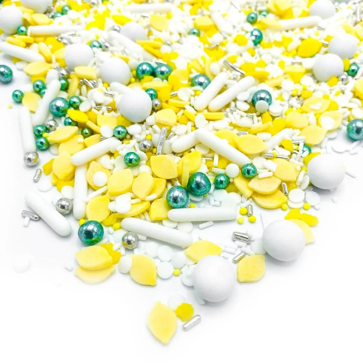 De Lemon Pie Crumble van Happy Spinkles ziet er niet alleen heel erg fris uit, maar zo smaakt hij ooknog eens! De witte en gele hagelslag, chocoladebolletjes, suikersticks en de suikercitroenen laten de spinkel er niet alleen heel goed uit zien, maar door de kleine citroenstukjes smaakt de mix ook nog eens heerlijk. Door de metallic groene en zilveren parels krijgt de mix ook nog eens een kleine glitter en glamour look, wat wil je nog meer.