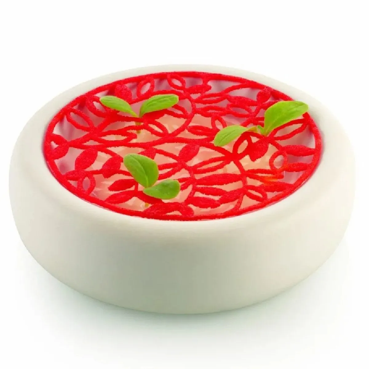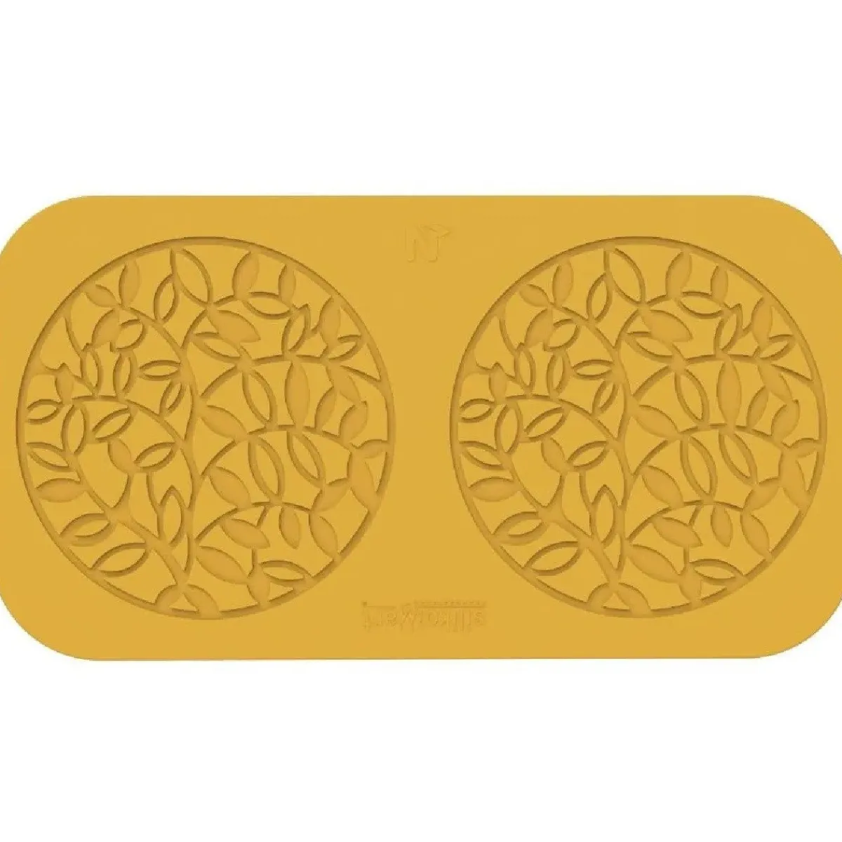 De Silikomart siliconen mat Esotico (2) Ø140×2 mm is een verfijnde decoratiemat waarmee je elegante bladerpatronen creëert in bijvoorbeeld chocolade, isomalt of krokante massa’s. De mat bevat twee ronde vormen met een diameter van 14 centimeter. Ideaal voor het maken van strakke, gedetailleerde schijven als finishing touch op taarten, gebak of desserts.