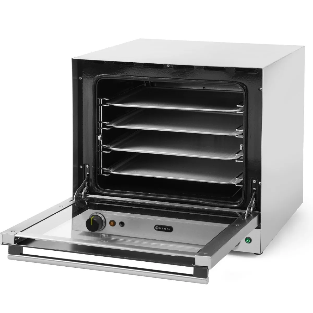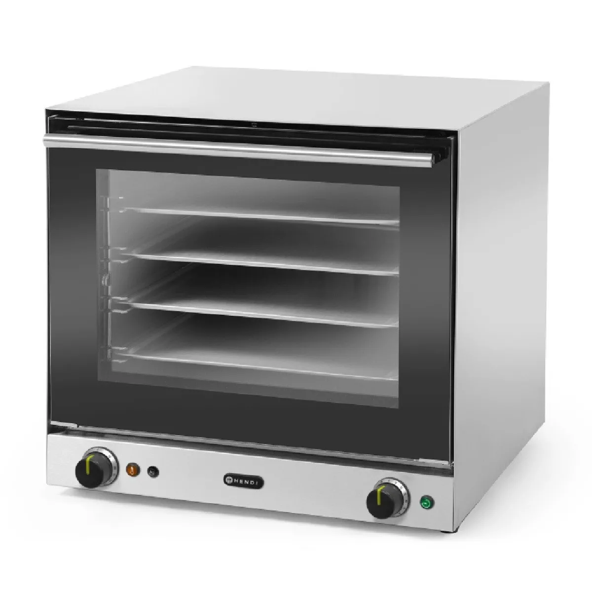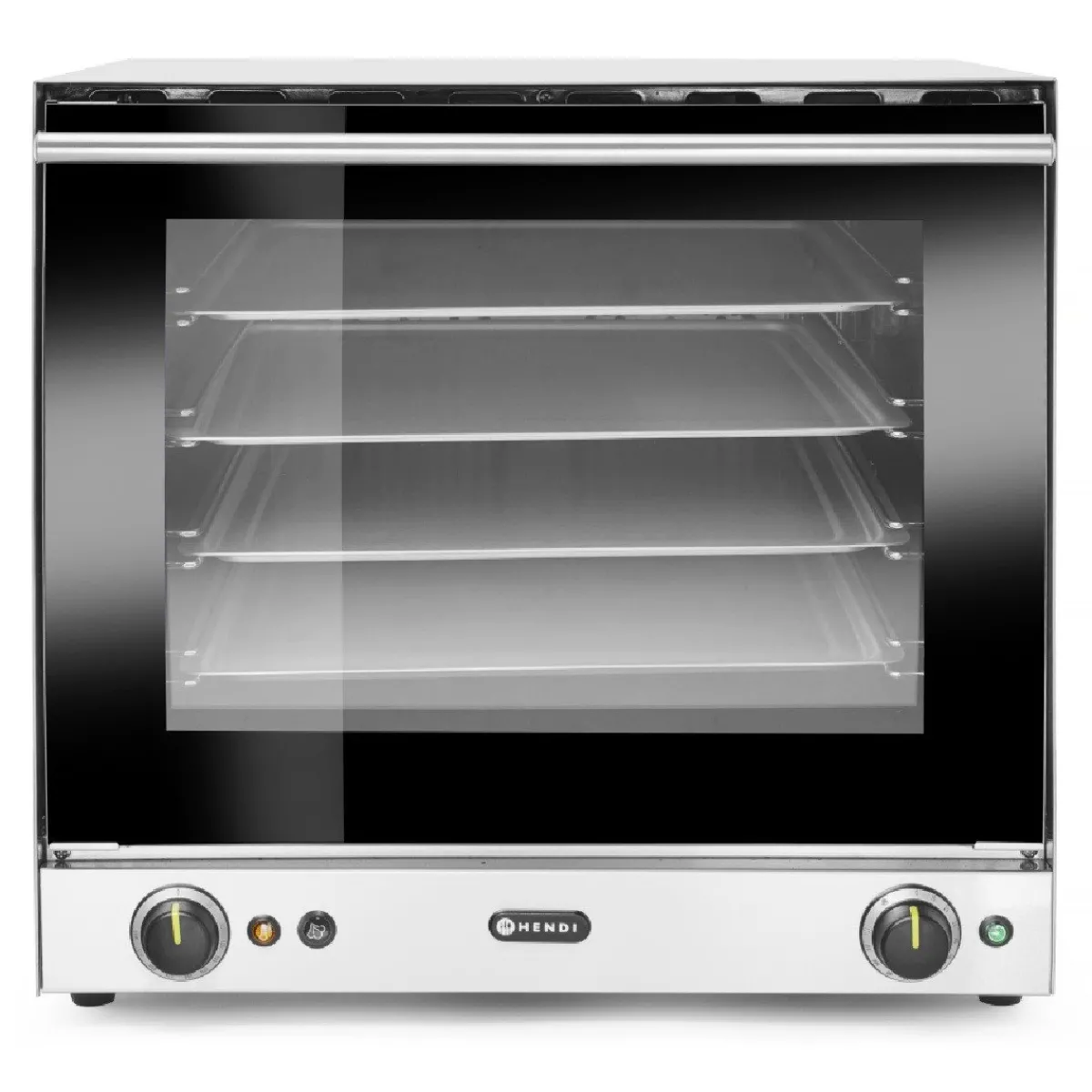 De Hendi Heteluchtoven met Vochtinjectie H90S heeft een roestvrijstalen behuizing en een deur met dubbelglas. De binnenkant heeft gedeeltelijk geëmailleerd materiaal en verlichting. Het verwarmen gebeurt door 2 verwarmingselementen en 2 ventilatoren tot maximaal 300°C. Door een handmatig bedienbare drukknop kun je direct vocht injecteren. De oven wordt geleverd met 4 trays, die in de oven een afstand tussen elkaar hebben van 7 centimeter. De deur heeft een cool touch en kan eraf gehaald worden voor het schoonmaken.
