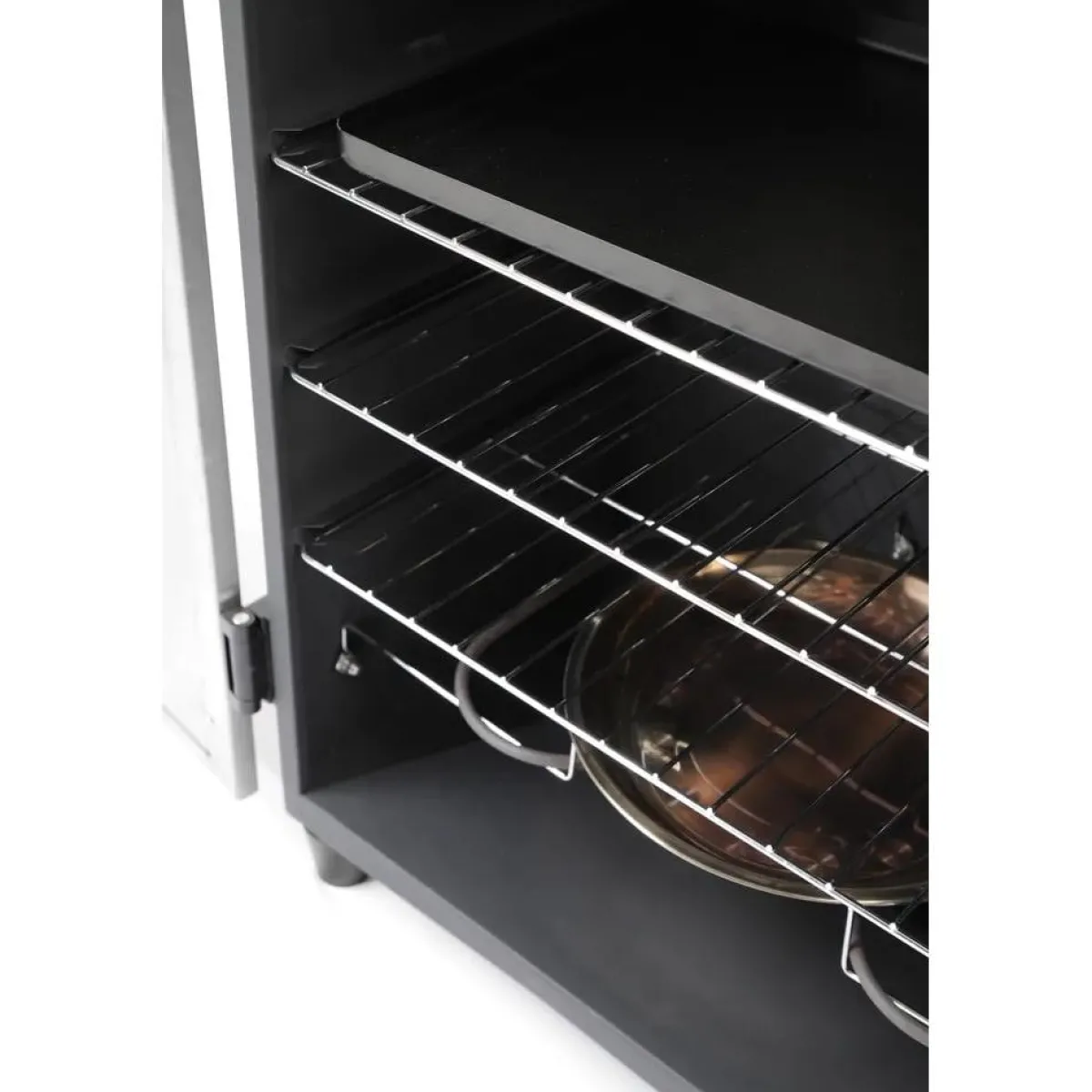 De rookoven is ideaal voor het roken en bereiden van vis, vlees, ham en groenten. Deze uitvoering is vervaardigd uit Gemaakt van roestvast staal met magnetisch sluitende dubbel geïsoleerde deur. Temperatuur in te stellen via een thermostaat, geïntegreerde thermometer in de deur. Voorzien van een ventilatieopening aan de achterzijde. Wordt geleverd met 3 stuks 400×279 mm roosters en beugel met 3 haken.