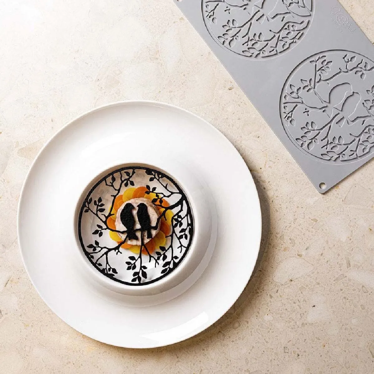 De Pavoni Me&You siliconenvorm is een hulpmiddel voor het creëren van romantische decoraties met een uniek silhouet van twee vogels op een tak. De mal bestaat uit twee ronde vormen met een doorsnede van 14 centimeter.