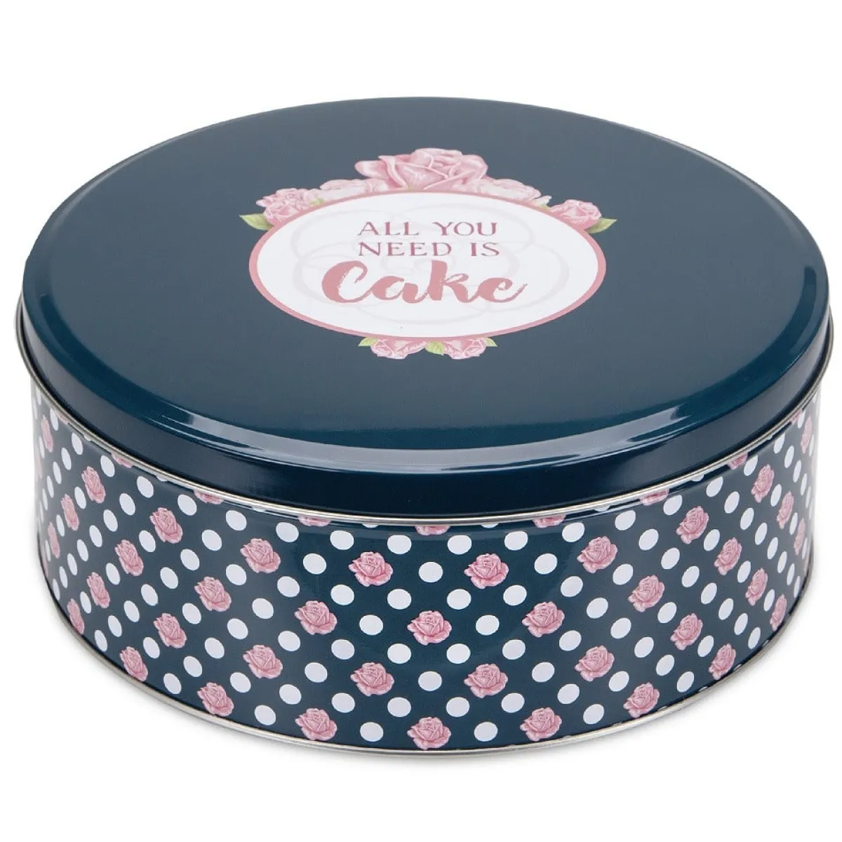 Opberg blik voor de lekkerste koekjes en gebakjes. Het blik is rond en heeft een leuk design met roosjes om de zijkant en een deksel met daarop “All you need is cake”.