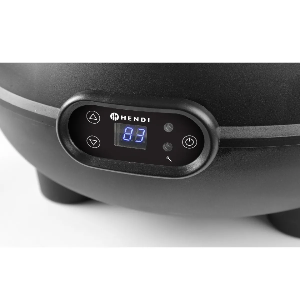 De Hendi Soepketel met Digitale Display is een elektrische soepketel, die onder andere perfect tijdens buffetten kan worden gebruikt. De pan heeft een zwarte buitenkant met aan de onderkant rubberen anti-slip pootjes. Er zit een display aan de voorkant die de ingestelde en huidige temperatuur weergeeft. De thermostaat kan ingesteld worden van 65° tot 95°C. Bovenop de soepketel zit een transparante deksel van polycarbonaat met een geïsoleerde handgreep, een lepeluitsparing en een naamkaartjeshouder. Aan de binnenkant kan een aluminium waterpan gevuld worden, voor een efficiënte warmt overdracht.