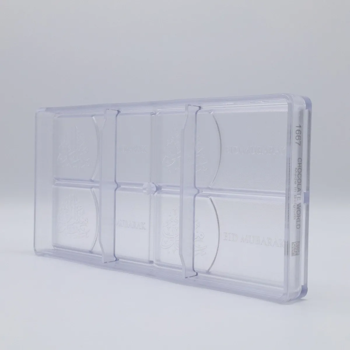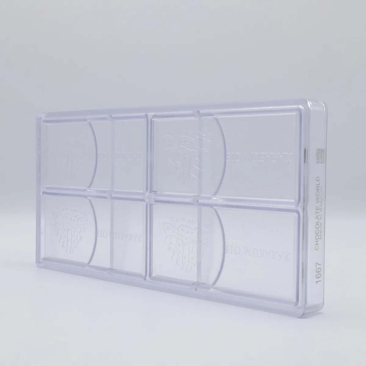 De Chocolademal Chocolate World Tablet Eid Mubarak (4x) is perfect om chocoladerepen te maken voor feestelijke gelegenheden. Deze repen zijn 12,5 centimeter lang, 5,5 centimeter breed en 0,7 centimeter dik. In de mal kun je 4 repen tegelijk creëren.