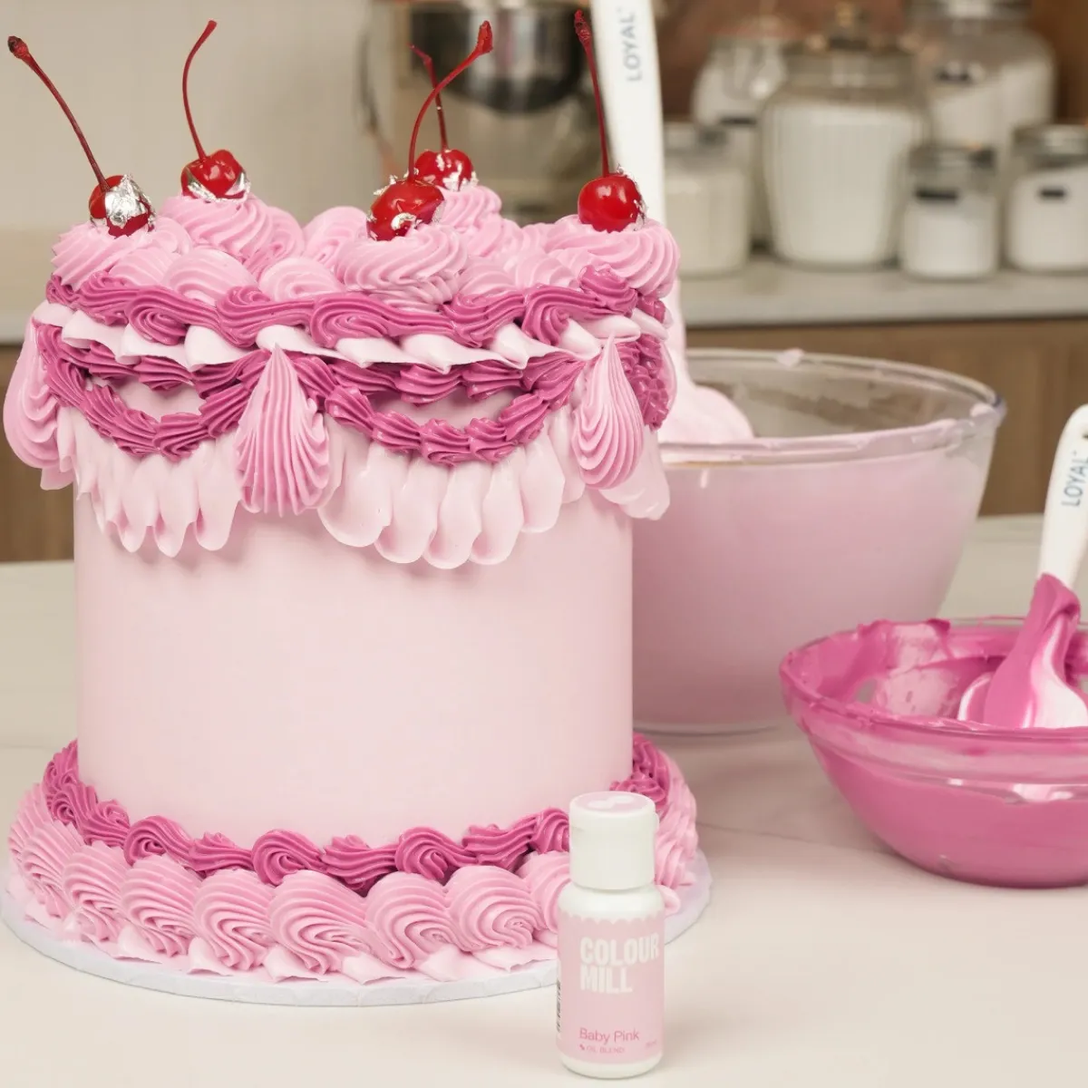 Met de Colour Mill Kleurstof Oil Blend Baby Pink 100ml geef je creaties een subtiele pastelroze uitstraling. De kleurstof is volledig op oliebasis, waardoor hij uitstekend mengt met vetrijke bereidingen zoals botercrème, chocolade, fondant, ganache en marsepein. De geconcentreerde pigmenten zorgen daarbij voor een zachte maar heldere kleur, zonder strepen.