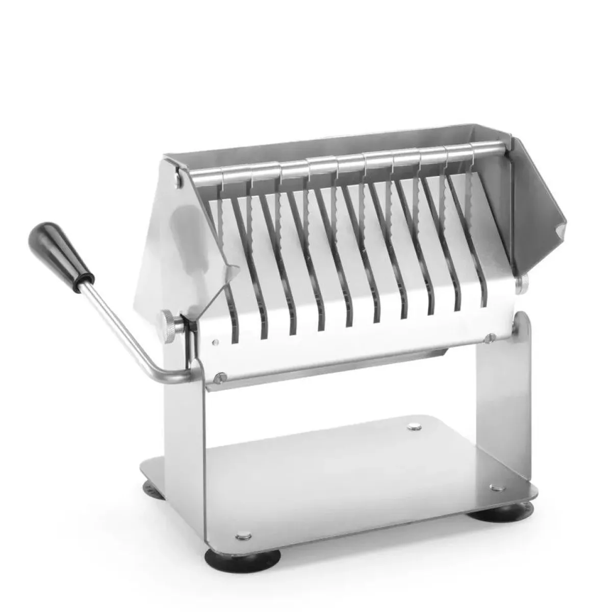 Stabiele voet door zuignappen. Hoogwaardige gekarteld geslepen messen. Eenvoudig te reinigen. Snijdt 11 plakken.