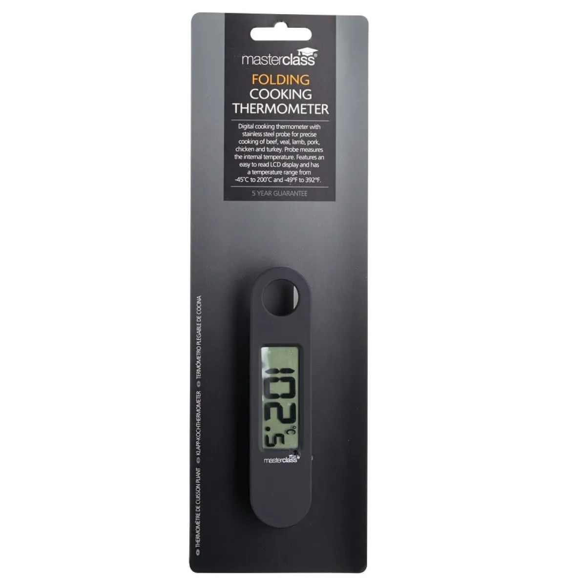 Thermometer met een invouwbare prikker. De thermometer heeft een LCD scherm waardoor de temperatuur makkelijk te lezen is. Deze thermometer kan meten van -45°C tot 200°C en beschikt over een alarm functie.