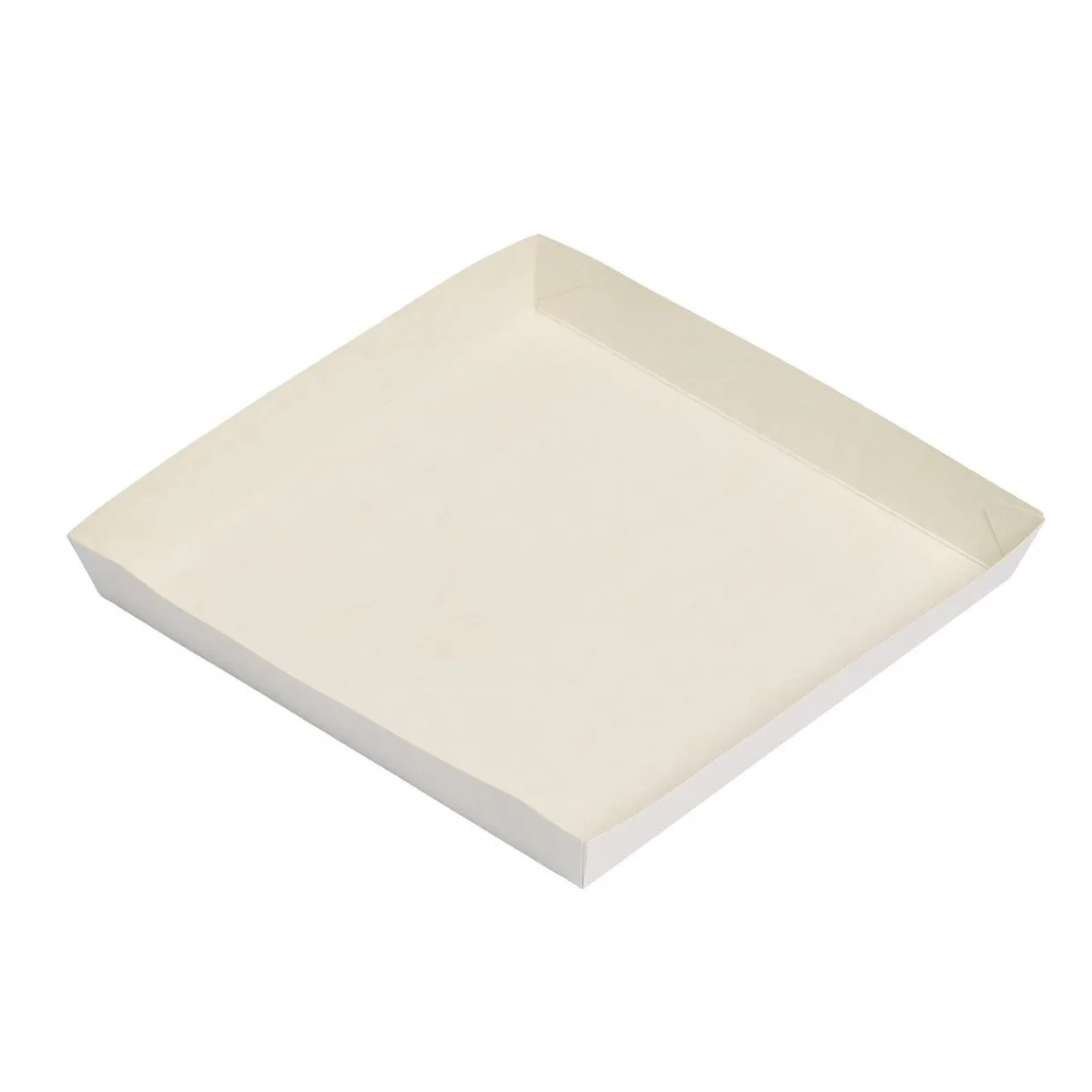 De Kartonnen Schaal Conisch 19x19x2,5 cm (300 stuks) heeft een vierkante vorm en is ideaal voor het verpakken of presenteren van allerlei lekkernijen. Door de opstaande randen blijven producten goed op hun plek, zowel tijdens transport als presentatie.