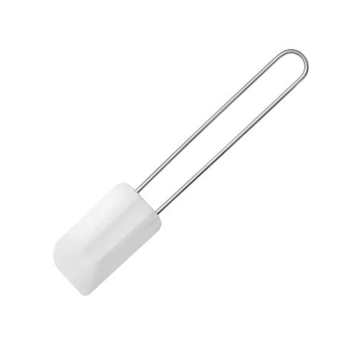 Elastische spatel met een flexibel rubberen blad. De pannenlikker heeft een metalen steel/handvat. Totale lengte van de pannenlikker is 20 cm. Het blad (wit van kleur) is 6 x 3 cm.