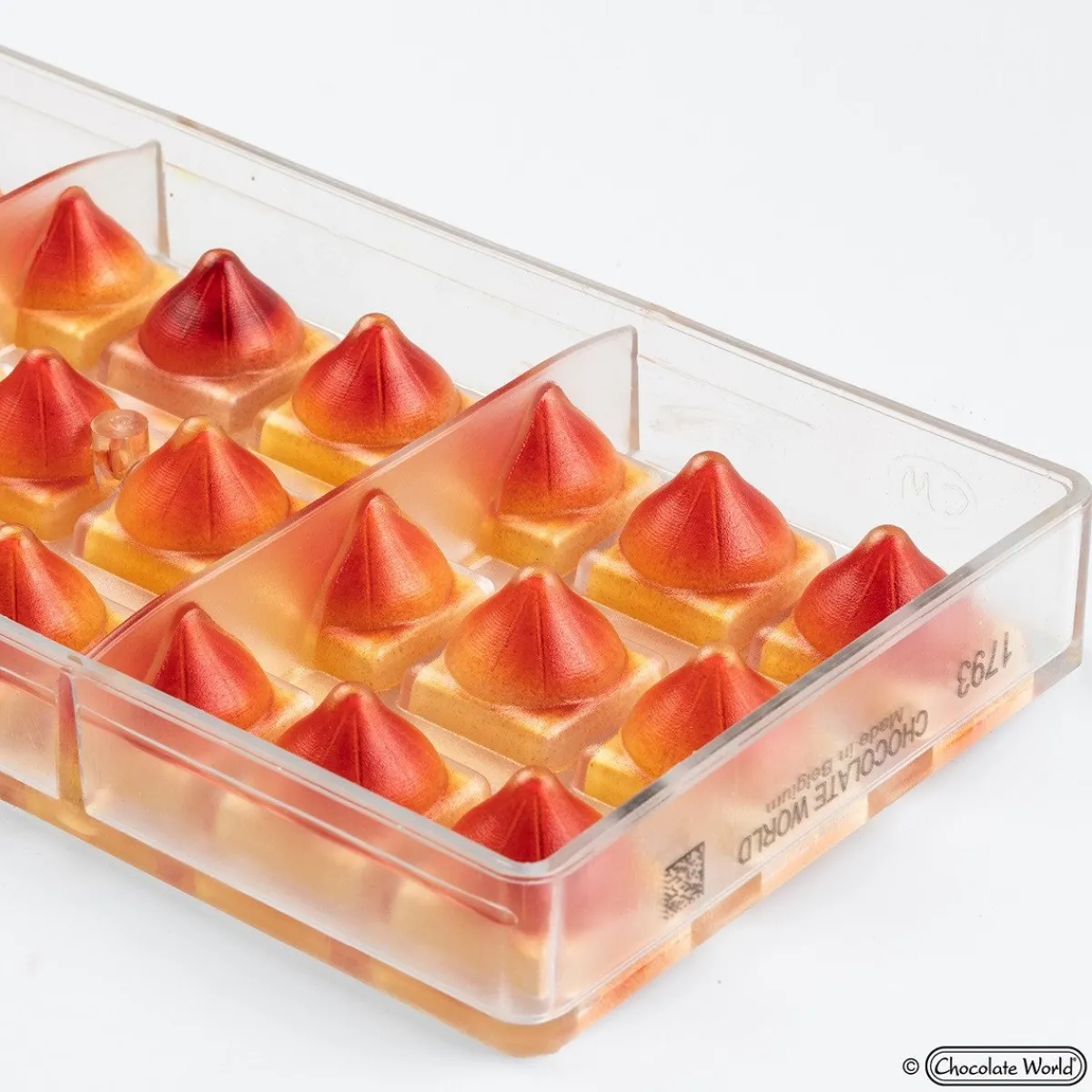 Deze Bonbonvorm Chocolate World Koepel (24x) 26x26x23,5mm heeft 24 holtes met elk een afmeting van 2,6 bij 2,6 centimeter en een hoogte van circa 2,3 centimeter. Met deze mal kun je bonbons maken in de vorm van een koepel met daaronder een vierkant blokje.