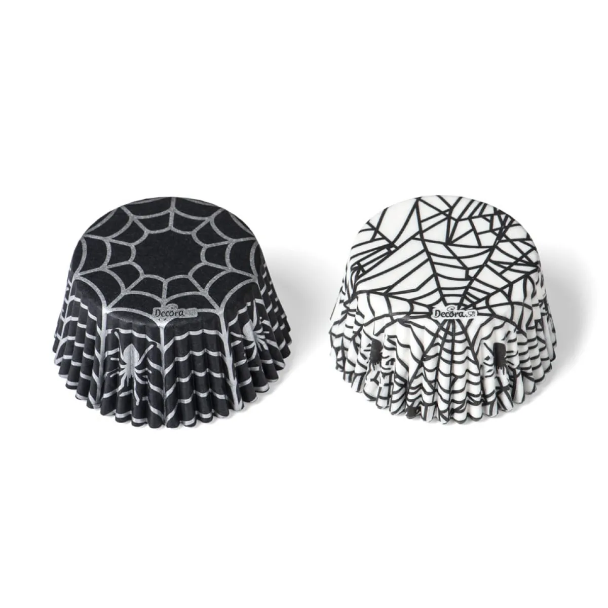 Zijn er spinnen langs geweest of lijkt dat zo? Met deze cupcake cups van Decora geef je cupcakes een spinnenweb uitstraling, speciaal voor Halloween. Er zitten twee verschillende cups in de set, een zwarte cup met witte bedrukking en een witte cup met zwarte bedrukking. Voor het beste resultaat van je cupcakes is het aan te raden om de cups in een cupcake/muffin-bakvorm te plaatsen. Na het bereiden van de cupcakes kun je cups om je cupcakes laten zitten en ze zo op tafel serveren.