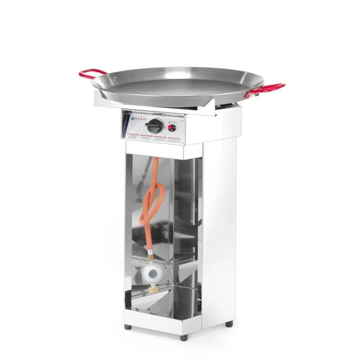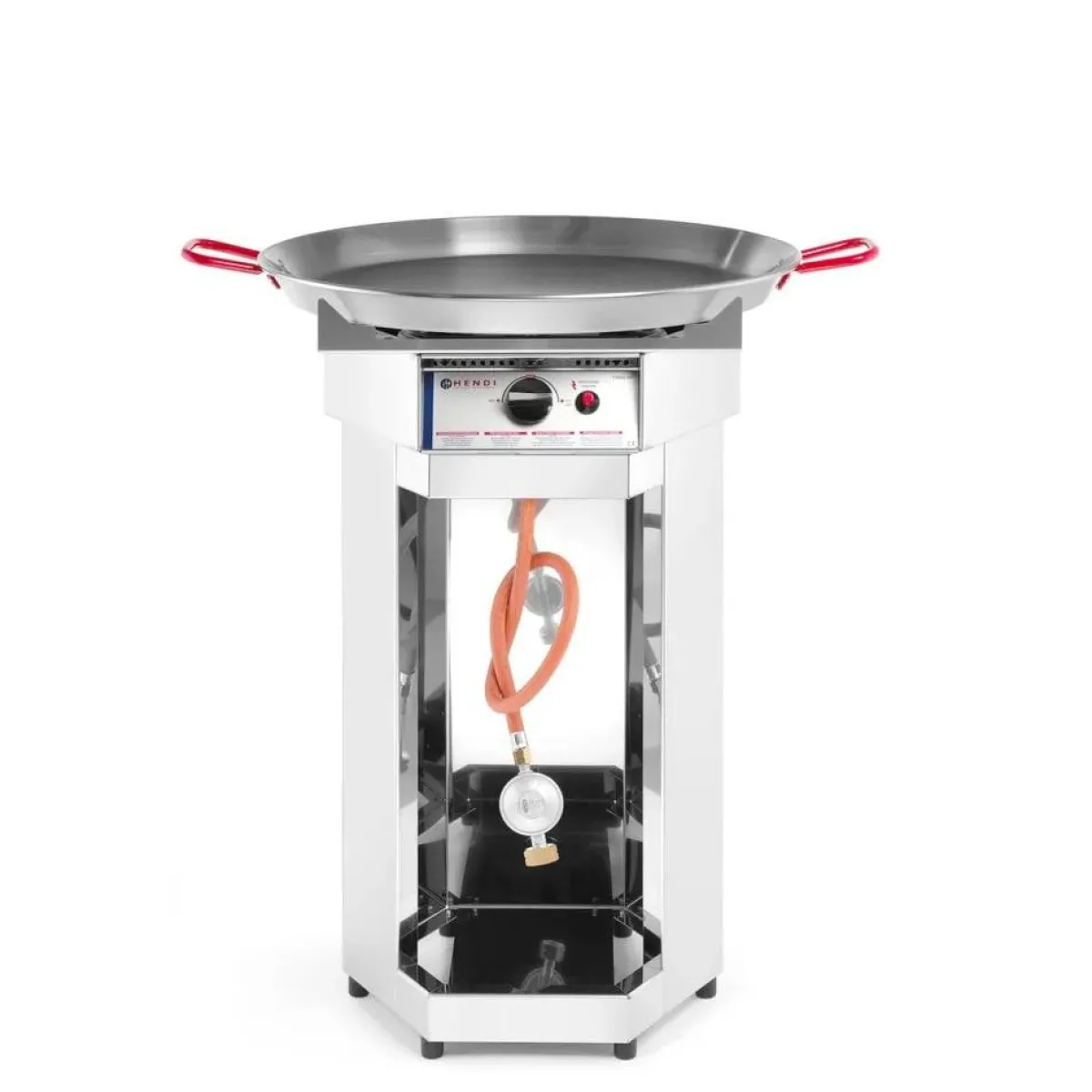 Behuizing van roestvast staal, met plaatstalen paella pan ø600 mm. Inclusief gasslang, elektronische ontsteking en drukregelaar. Voorzien van thermokoppel en een ronde brander. Branderunit demontabel voor eenvoudig reinigen. Uitermate geschikt om te gebruiken bij gasflessen van 5 of 6 kg. Uitermate geschikt om te gebruiken bij propaangas, verbruik 334 g/u.