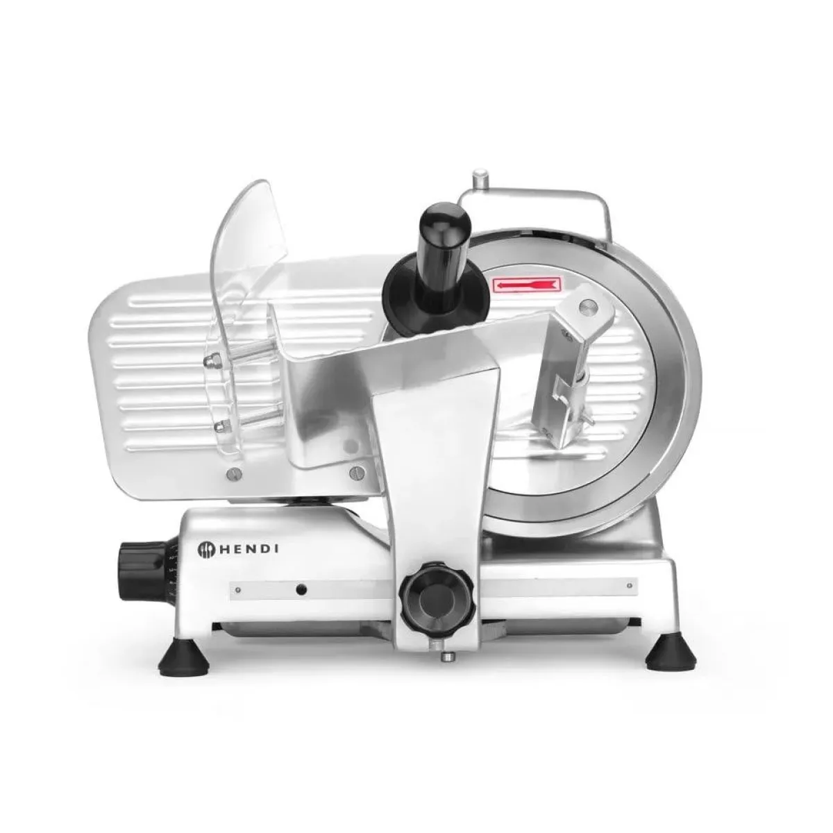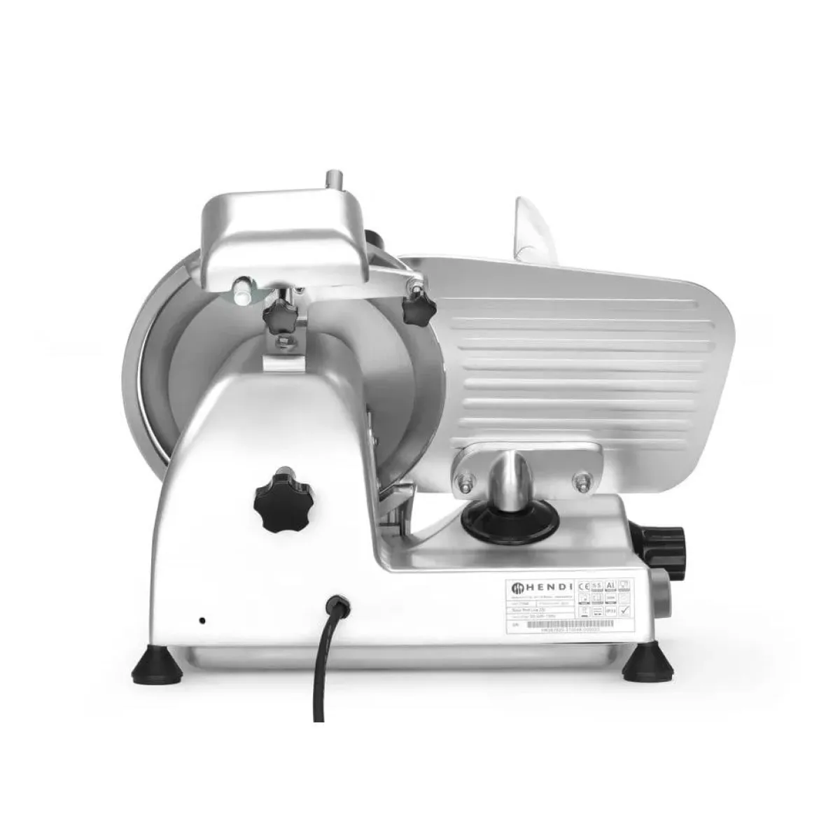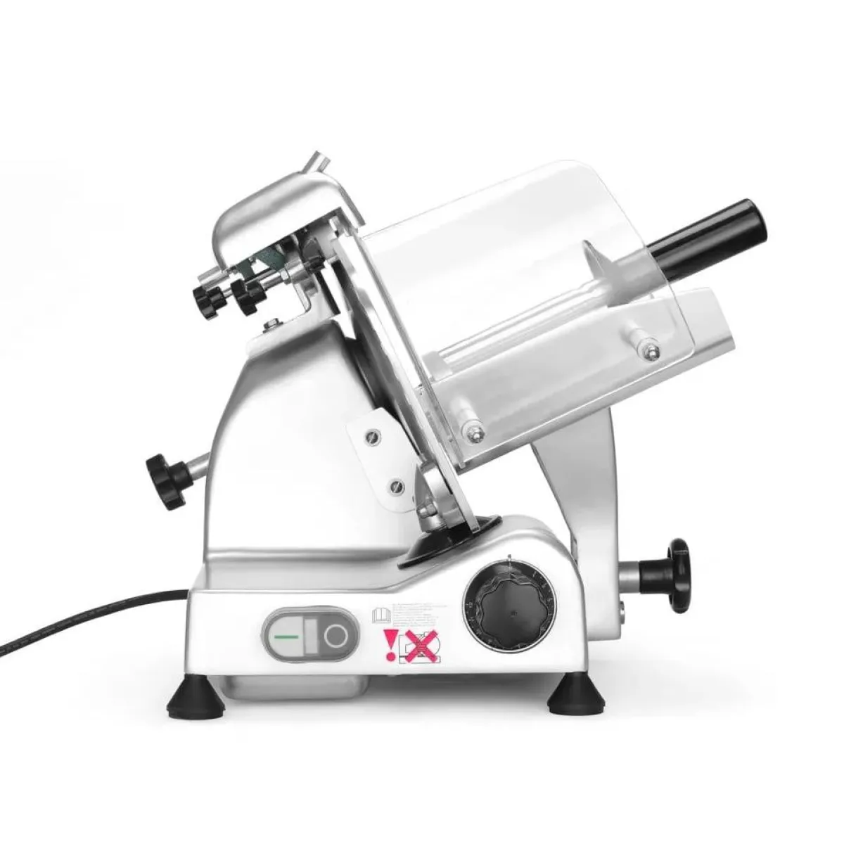 Behuizing van gecoat aluminium. Schuingeplaatst gehard roestvaststalen mes met groot koppel. Luchtgekoelde motor is voorzien van beveiliging tegen oververhitting. Motor heeft een extra hoog vermogen voor het snijden van harde vleeswaren. Voorzien van mes beschermer en slijpinrichting. Slede met veiligheidsschild en verticaal te vergrendelen restenhouder. Snel en eenvoudig te demonteren voor reiniging. Voldoet aan alle veiligheidseisen voor commercieel gebruik door o. A. :