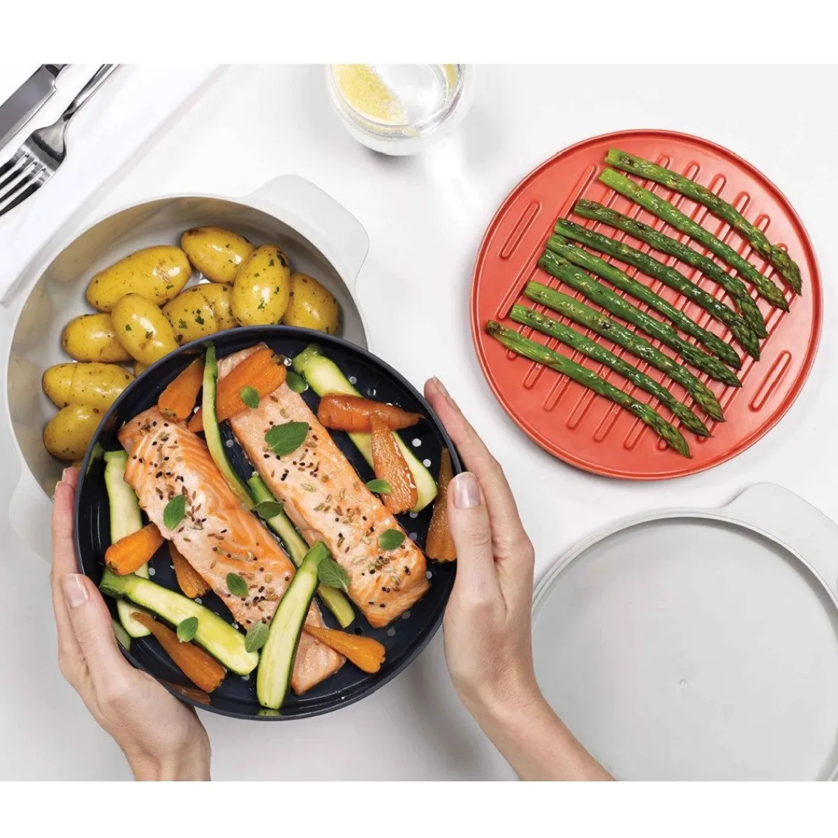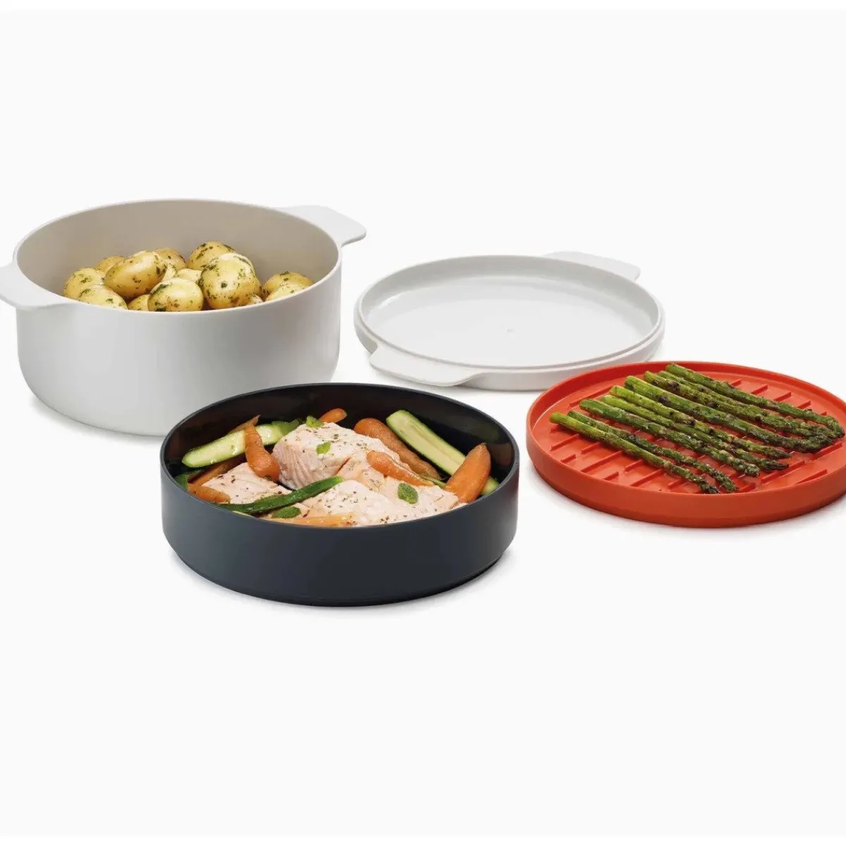 Met de Joseph Joseph Magnetron Kookset Set/4 is koken een fluitje van een cent. De set bestaat uit 4 onderdelen, die allemaal op elkaar gestapeld kunnen worden. Het is mogelijk om aardappels, pasta of rijst te koken in de kookpot, in het stoommandje kun je groenten en vis stomen en tot slot is de grill ideaal om onder andere bacon of champignons te grillen. En dat allemaal in de magnetron! Bovendien kan de deksel gebruikt worden op de kookpot en stomer, maar is deze ook geschikt als magnetronschaal. Binnen no-time staat er dus een heerlijke gezonde maaltijd op tafel.