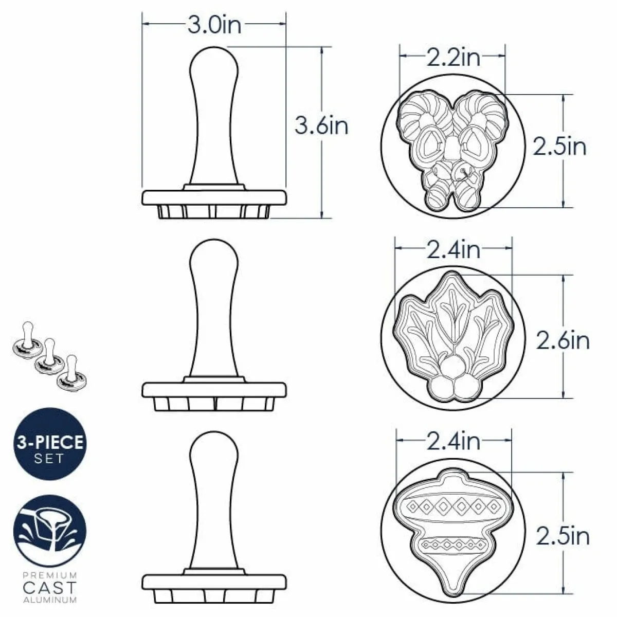 Zeer degelijke koekjesstempels van het merk Nordic Ware. Deze ‘cookie stamps’ zien er niet alleen mooi uit, ze werken ook fantastisch! Rol (koekjes)deeg uit en druk met de koekjesstempels eenvoudig gedetailleerde koekjes uit. Gebruik altijd koud deeg. Wanneer het plakkerig wordt kun je eenvoudig bloem of suiker gebruiken of de stempel licht invetten met olie. Deze set bestaat uit een kerstbal, zuurstokken en een maretak. Vervaardigd in Amerika van gegoten aluminium met een handvat van rood hardhout.