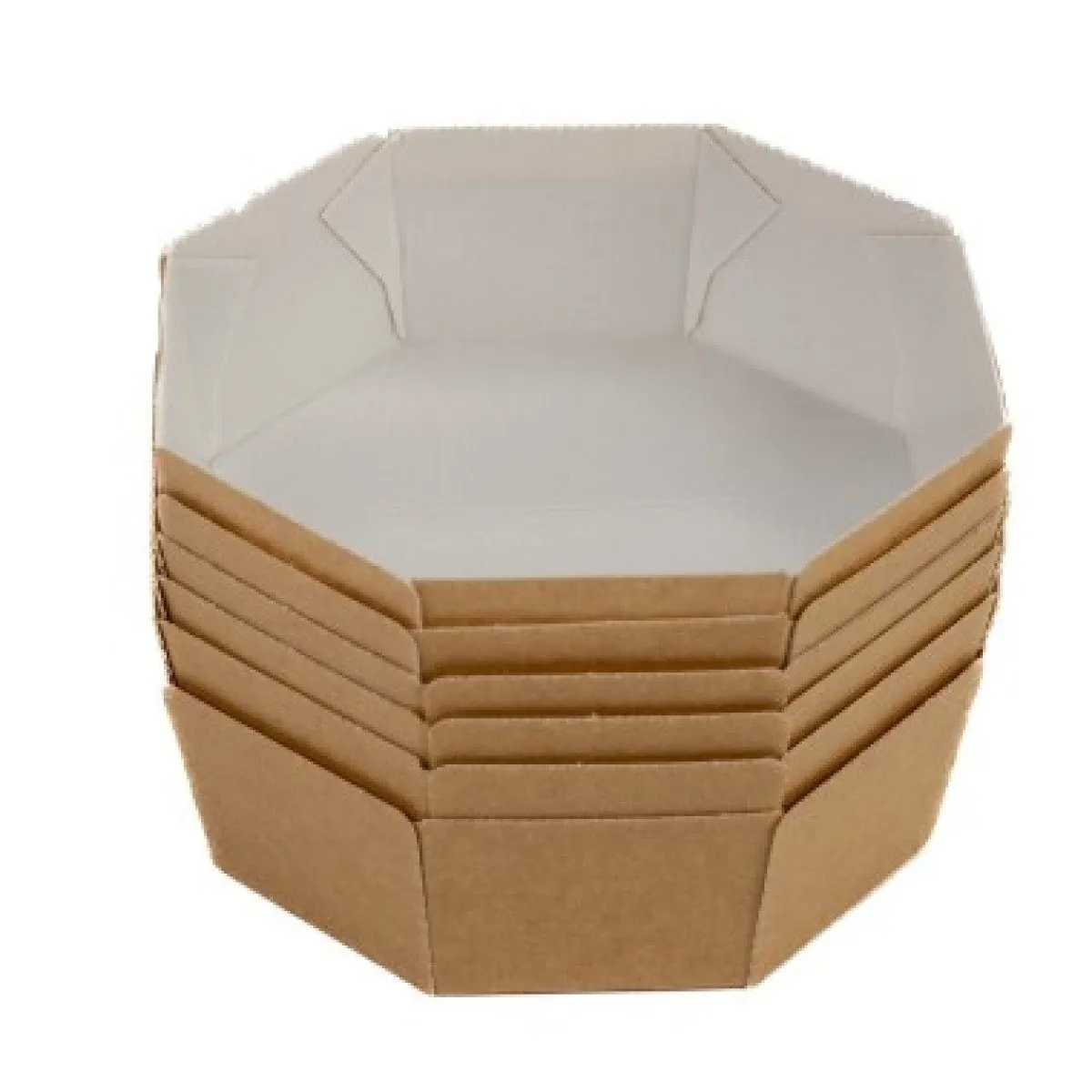 Deze achthoekige bakvorm van karton heeft een afmeting van 13 x 13 x 4,5 cm en wordt per stuk geleverd. De binnenzijde is wit, terwijl de buitenkant een natuurlijke bruine kleur heeft. De achthoekige vorm zorgt voor een opvallende presentatie van je creaties.
