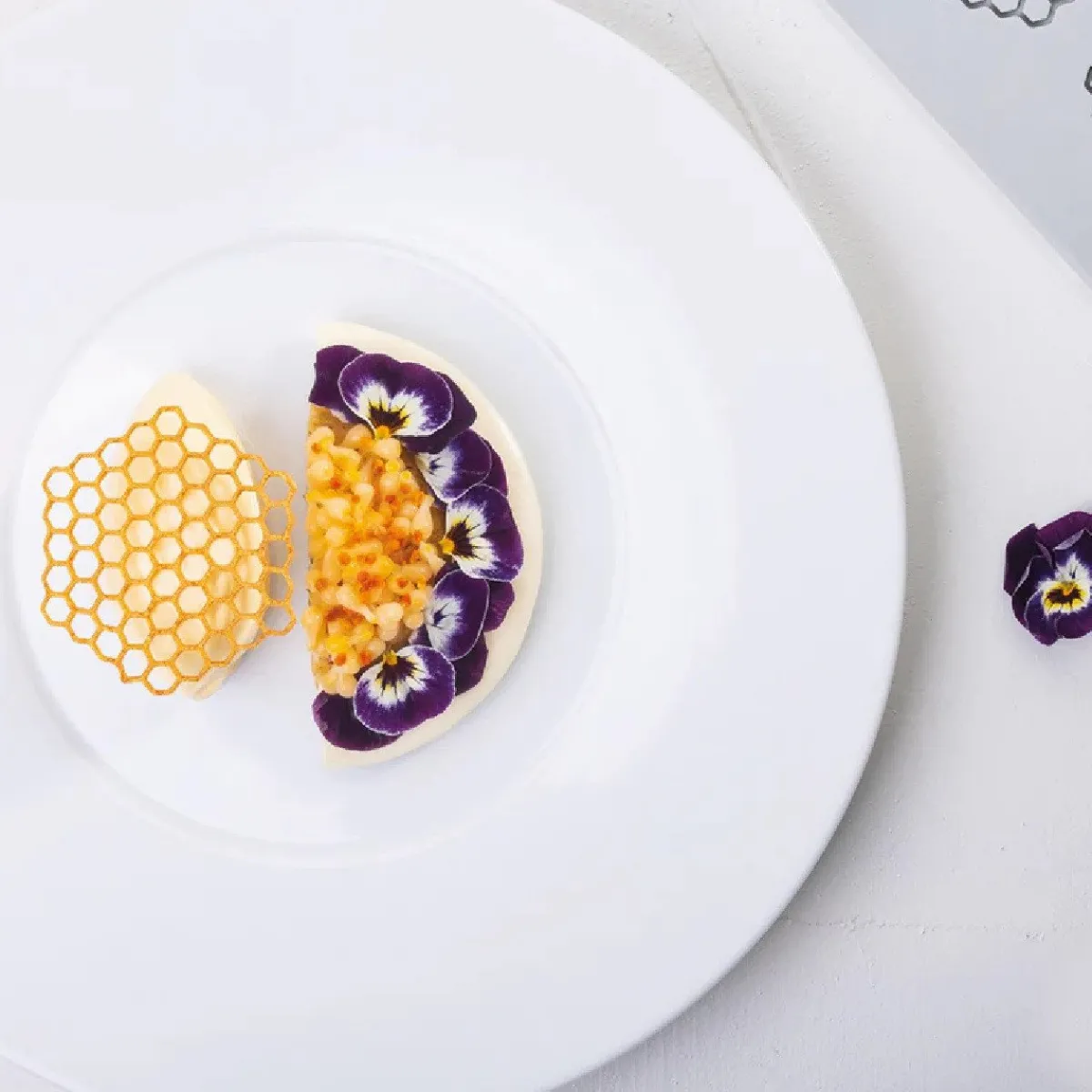 Deze vorm is perfect voor het maken van decoraties van isomalt, gekleurde chocolade of tuilemassa. De honingraatvorm past goed bij baksels met citroen, honing, vanille of bloemenaroma’s. Gebruik ze als topping op entremets, moussetaarten of plated desserts.