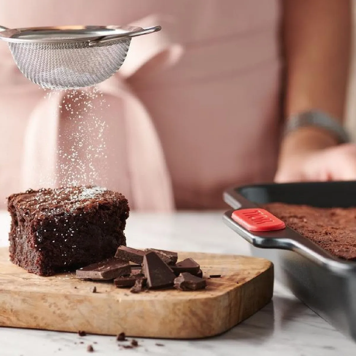 De bakvorm heeft een vierkante vorm en is 28 bij 28 centimeter en heeft een hoogte van 5 centimeter.