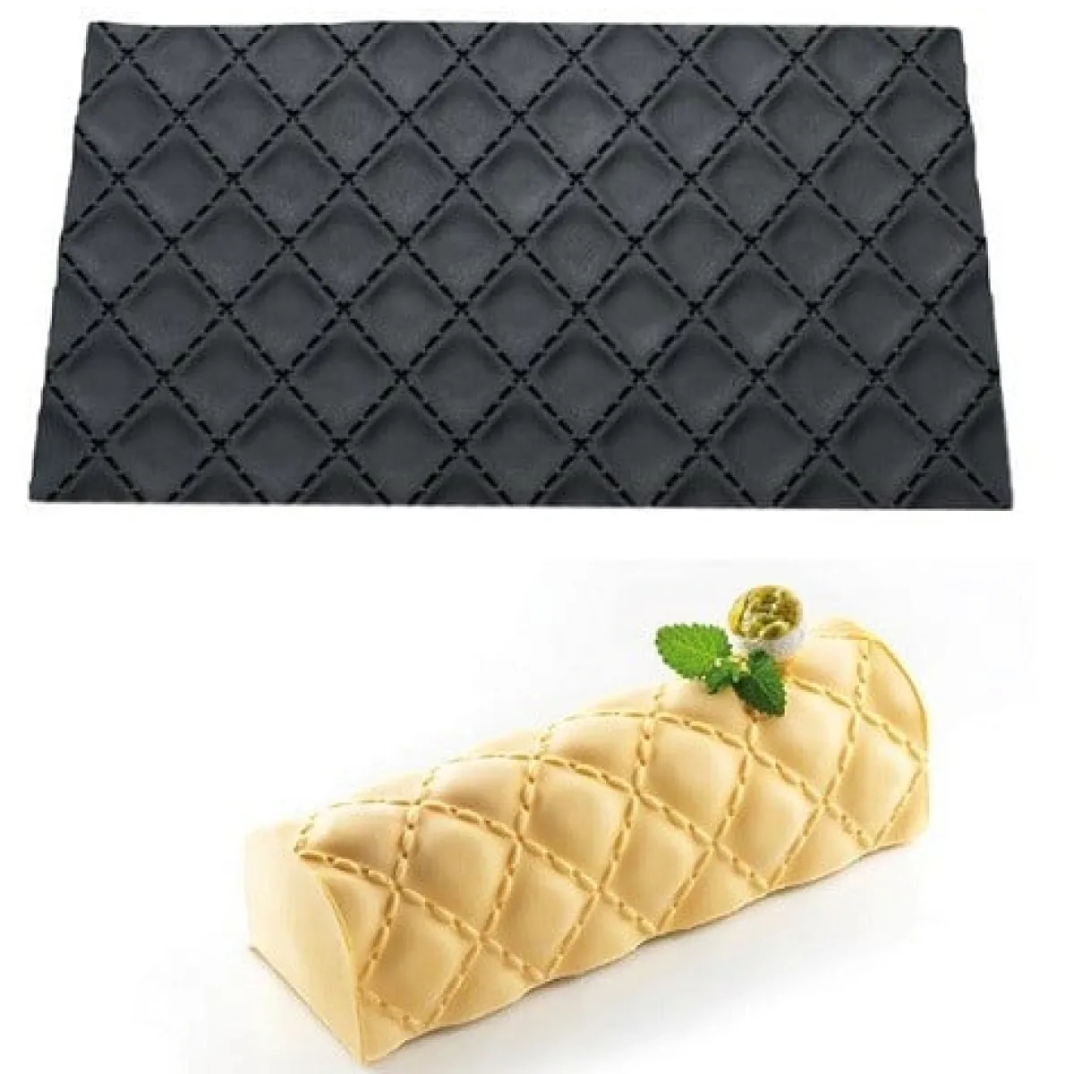 Met deze Silikomart reliëfmat van sterk siliconenrubber voorzie je je Bouwhuis rolfondant, marsepein of plastische chocolade snel en eenvoudig van een mooie, strakke ruitjes reliëfprint. Rol je Bouwhuis marsepein, rolfondant of plastische chocolade uit, leg de uitgerolde plak op de Reliëfmat, rol er nogmaals overheen en klaar is je decoratieve taartovertrek! Deze siliconen mat bevat een Martelassè structuur.