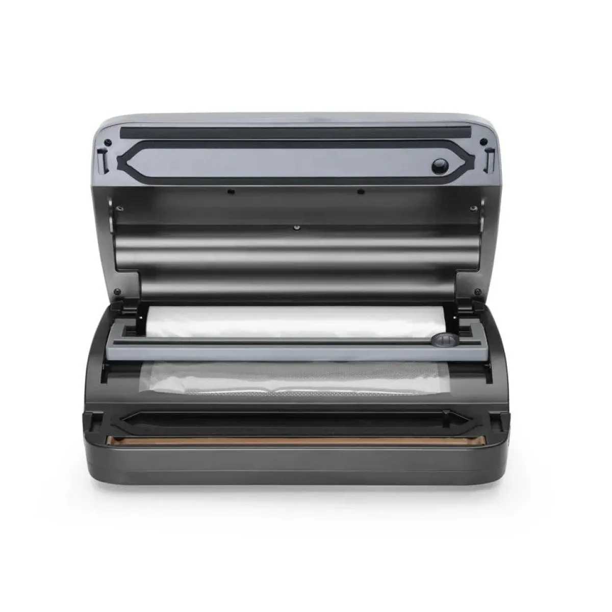 ABS-behuizing, speciaal ontwerp voorkomt dat vloeistof de pomp binnendringt. Ingebouwde container voor vacuümzakrol. Alleen voor vacuümzakken met reliëf met een max. Breedte van 300 mm. Keuze uit twee sealtijden en twee niveaus van vacuümkracht. Pompcapaciteit: 6,5 l / min ± 15%. De breedte van de sealbalk is 2,2 mm. Gewicht: ongeveer 2 kg.