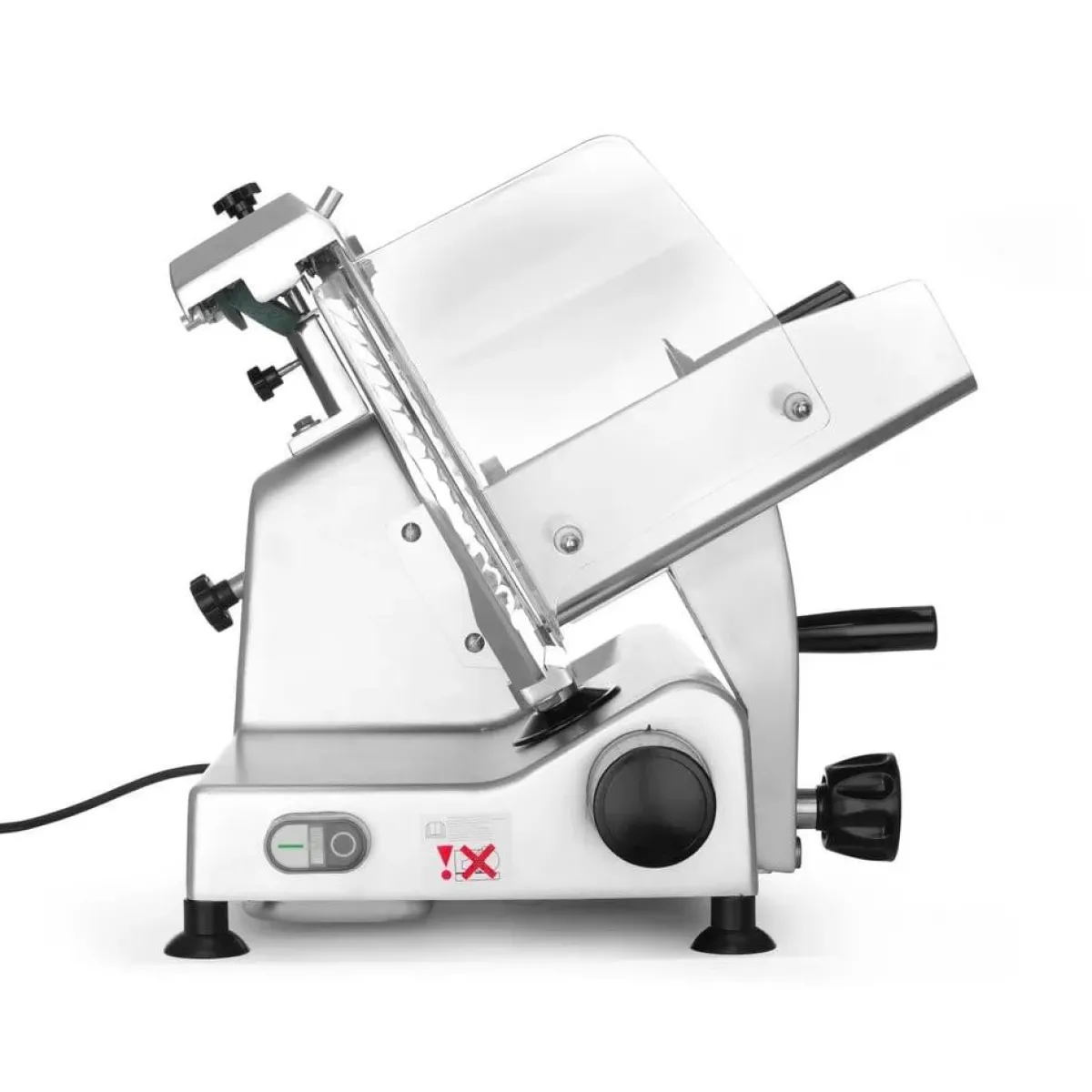 Behuizing van gecoat aluminium. Schuingeplaatst gehard roestvaststalen mes met groot koppel. Luchtgekoelde motor is voorzien van beveiliging tegen oververhitting. Motor heeft een extra hoog vermogen voor het snijden van harde vleeswaren. Voorzien van mes beschermer en slijpinrichting. Slede met veiligheidsschild en verticaal te vergrendelen restenhouder. Snel en eenvoudig te demonteren voor reiniging. Voldoet aan alle veiligheidseisen voor commercieel gebruik door o. A. :