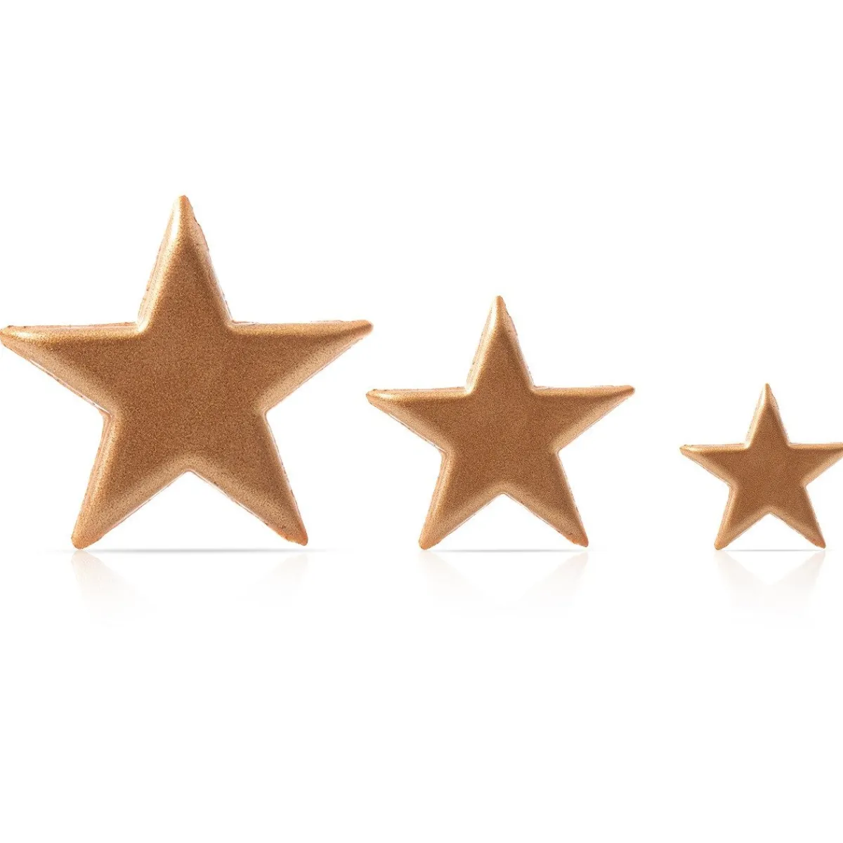De Dobla Chocoladedecoratie Sterren Brons Assortiment (132st) bestaat uit prachtige bronzen sterren in 3 verschillende formaten. De sterren hebben een doorsnee van 6, 4 en 3,2 centimeter. In totaal zitten 132 sterren in de verpakking, die perfect zijn voor het decoreren van diverse baksels en desserts.