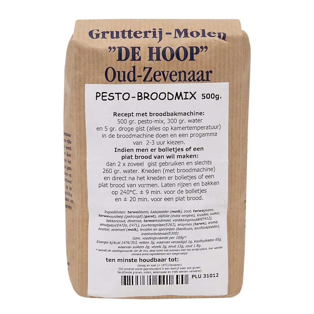 Pesto, je kunt het gebruik als tapende op brood maar je kunt het ook verwerken in brood. Maak een heerlijk hartig brood of hartige bolletjes met de Molen de Hoop Pesto Broodmix. Je kunt het brood serveren bij een (tomaten)soep, de borrel of bij een BBQ. Mogelijkheden genoeg om een pestobrood te serveren.