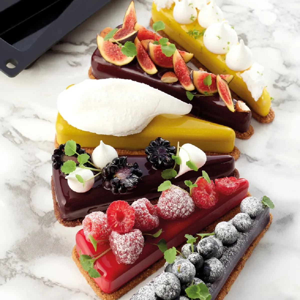 De Pavoni Siliconen Vorm Slake 114x39mm (8) is een siliconenmal waarmee je 8 gevormde puntdesserts of gebakjes tegelijk maakt. De vorm is ontworpen met een strak, modern silhouet dat doet denken aan een elegante taartpunt.