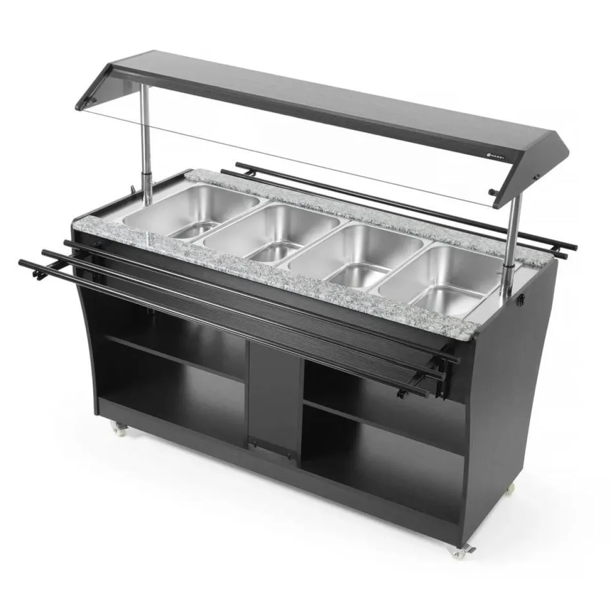 Het HENDI verwarmde buffet heeft ruimte voor 4 GN 1/1, die bij de set zijn inbegrepen. Het buffet is uitgerust met verlichting in de luifel, heeft 2 planken eronder voor het opbergen van borden en bestek en is gemakkelijk te verplaatsen dankzij 4 zwenkwielen. Dit buffet is de ideale oplossing voor zelfbedieningsgelegenheden of evenementen, omdat het aan beide zijden een plank heeft voor dienbladen en ervoor zorgt dat voedsel perfect warm wordt gehouden.