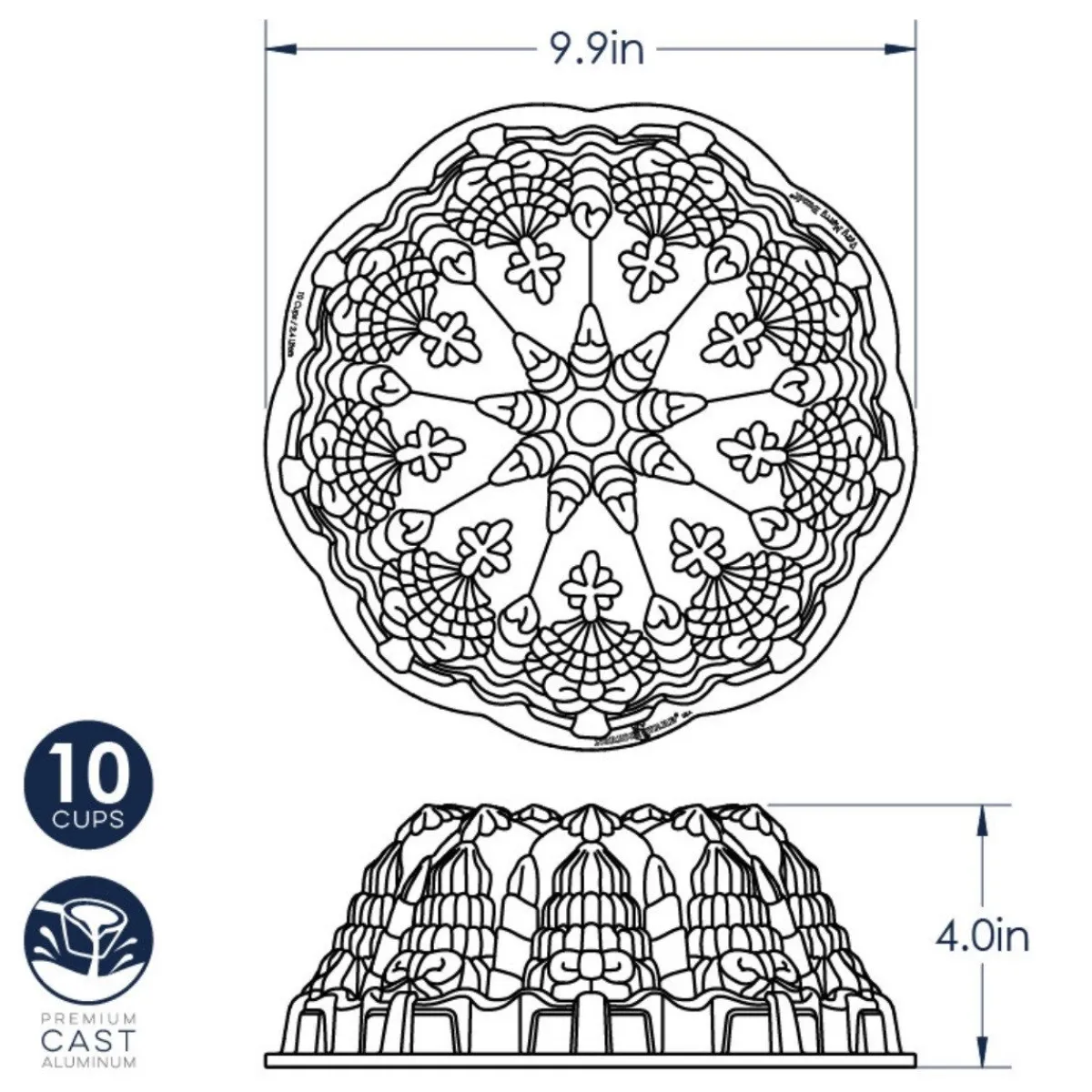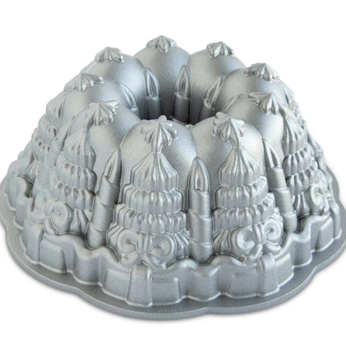 De Nordic Ware Very Merry Tulband Bakvorm is geweldig om te gebruiken tijdens de kerstdagen. De tulband bakvorm heeft een mooie zilveren kleur en is gemaakt van gegoten aluminium met een non-stick coating. De bakvorm bevat een design van kerstbomen, kaarsen en cadeaus met linten. Perfect om een simpele vanille cake in te bakken, maar ook erg leuk voor het maken van een chocolade- of een gingerbreadcake.