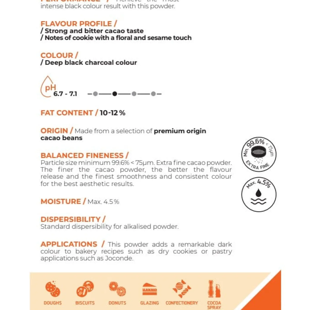 Deze hoogwaardige kwaliteit cacaopoeder bestaat uit 100% cacao en 10-12% cacaoboter. Deze zwarte variant wordt Noir Intense (ook wel diep donker of diep zwart) genoemd.