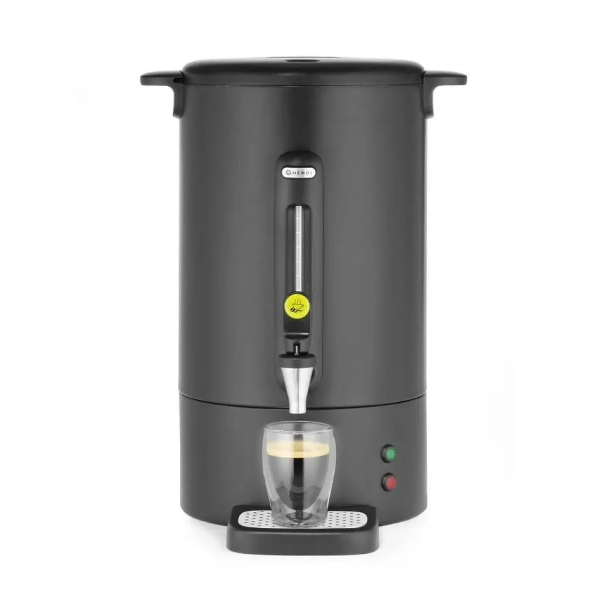 De HENDI Percolator – Design by Bronwasser is gemaakt met precisie en stijl – valt op bij elk buffet met zijn strakke matzwarte afwerking. Uitgerust met praktische functies zoals een non–drip kraan, waterniveau-indicator en schakelt automatische om naar warmhouden, zorgt hij voor een soepele koffieservice bij elk kopje koffie.