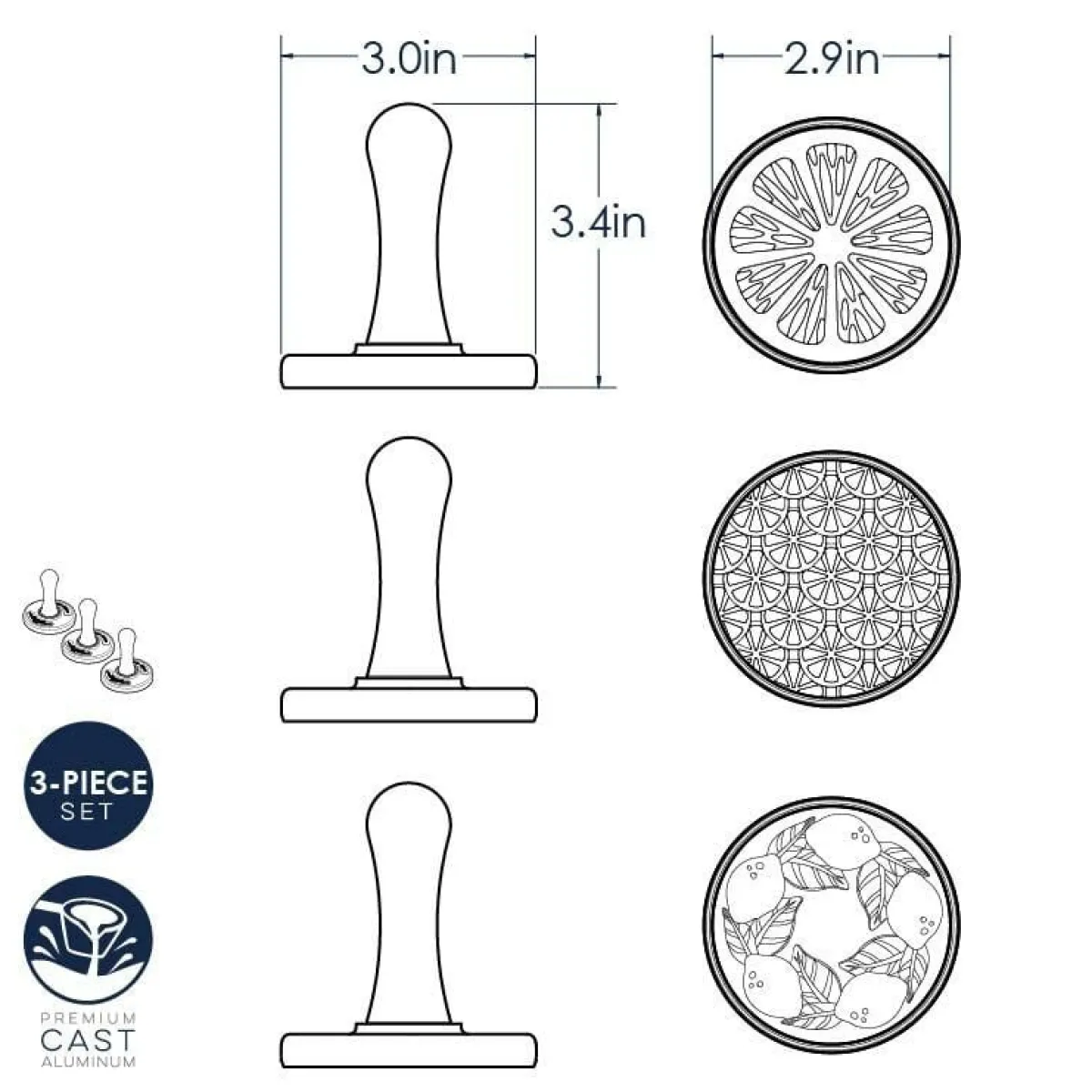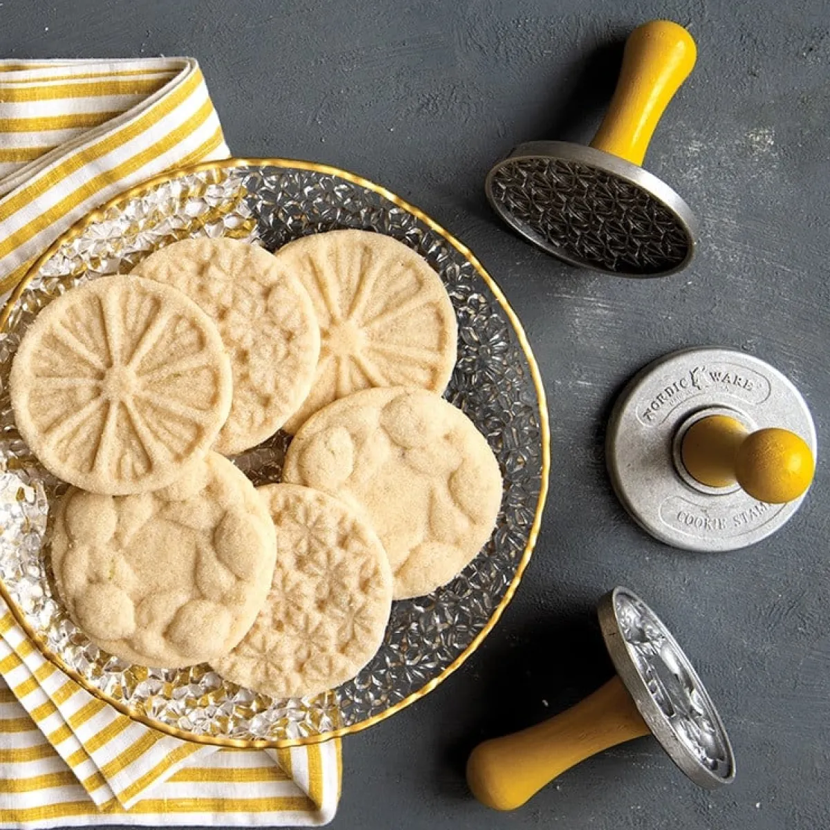 Zeer degelijke koekjesstempels van het merk Nordic Ware. Deze ‘cookie stamps’ zien er niet alleen mooi uit, ze werken ook fantastisch! Rol (koekjes)deeg uit en druk met de koekjesstempels eenvoudig gedetailleerde koekjes uit. Gebruik altijd koud deeg. Wanneer het plakkerig wordt kun je eenvoudig bloem of suiker gebruiken of de stempel licht invetten met olie. Deze set bestaat uit citroenen, citrus schijfjes en. Vervaardigd in Amerika van gegoten aluminium met een handvat van rood hardhout.