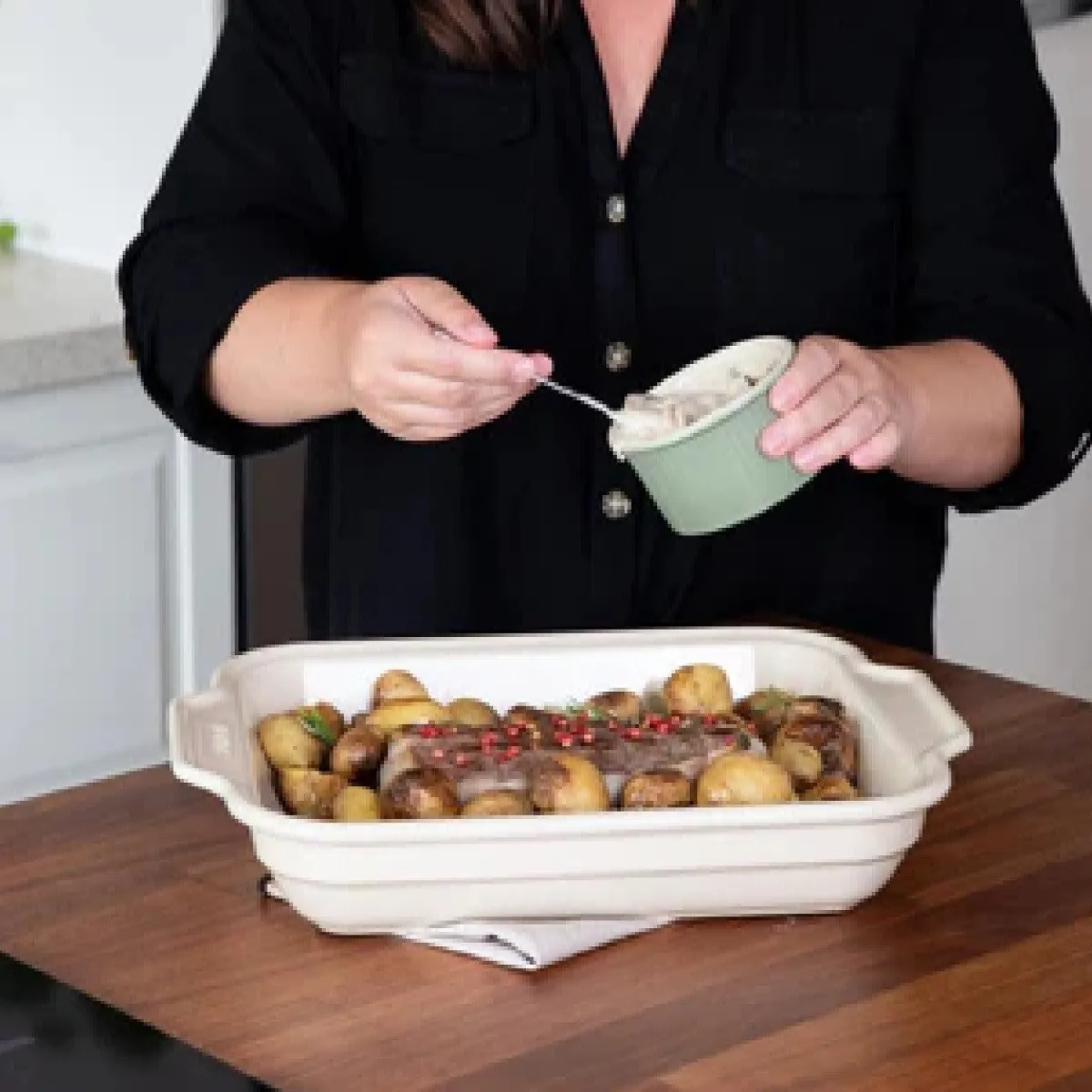 De schaal is voorzien van handige handvaten aan de zijkant, voor een goede grip. Verder kan de keramische ovenschaal uiteraard gebruikt worden om eten in te bereiden of te verwarmen, maar staat deze ook fantastisch op een mooi gedekte tafel.
